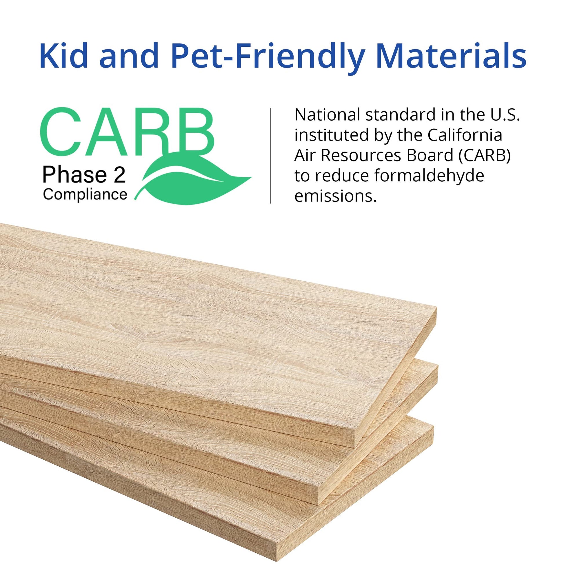 - CARB CertificationCARB Phase 2 compliant: National standard in the U.S. instituted by the California Air Resources Board (CARB) to reduce formaldehyde emissions. Our panel of the L-shaped bookcase is certified by CARB with formaldehyde emission below 0.09 ppm. Therefore, this Display shelf is suitable for families with children and pets and has no negative effect on health. Besides, the smooth surface of the wood panel is waterproof and easier to clean.