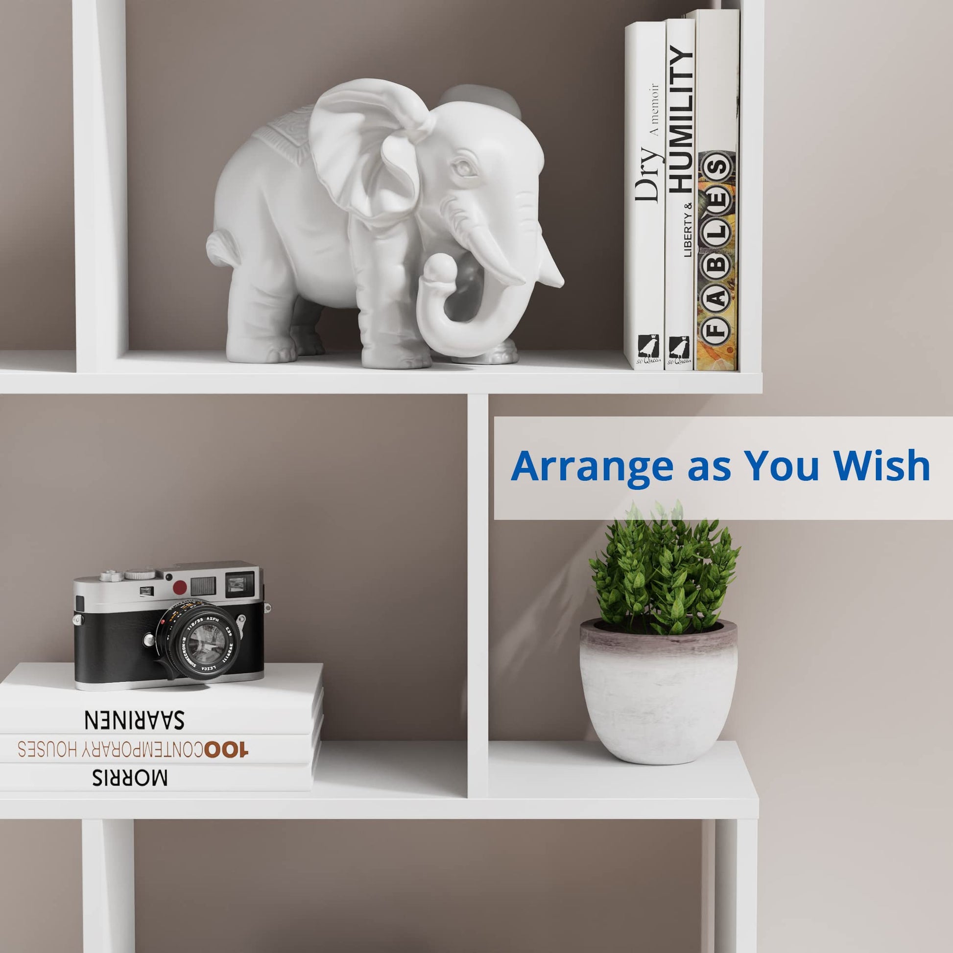 - 5-Tier S-Shaped Bookcase: Each shelving unit has artwork stickers to conceal screw hardware for a neat and attractive finish; the simple style and functional design of this contemporary bookshelf is suitable for all types of living and working spaces; whether you're in a dorm, flat, house, or office, the classic silhouette and geometric design of this bookshelf will match your setting, furniture, and style perfectly