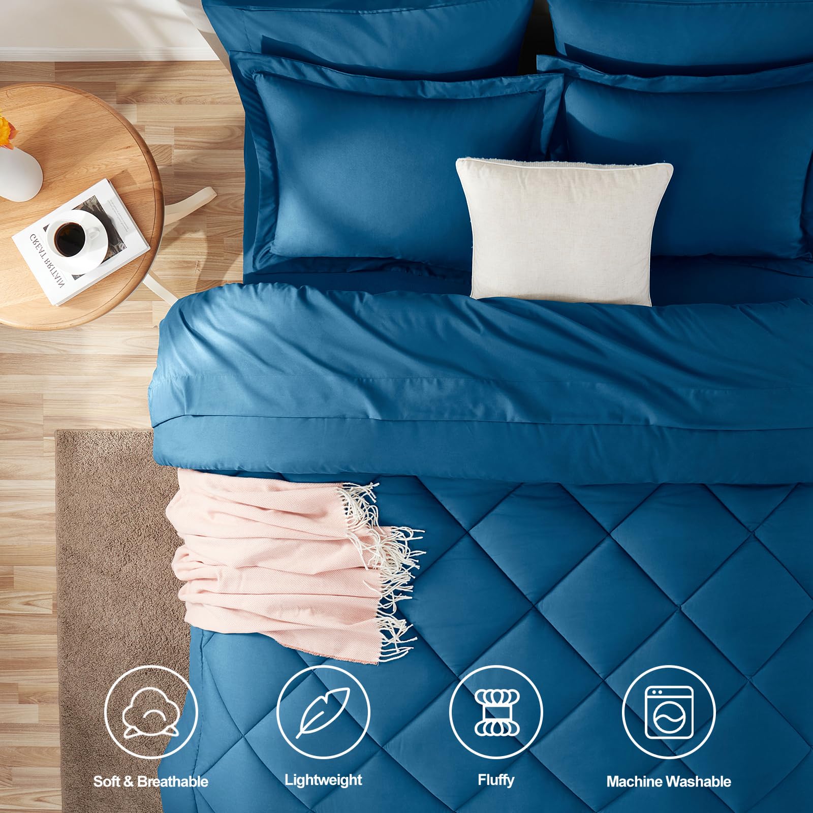 - What You Can Get: Queen Size bed in a bag includes 1 Comforter 88"x88", 2 Pillow Shams 20"x26", 1 Flat Sheet 90"x102" , 1 Fitted Sheet 60"x80"+14" and 2 Pillowcase 20"x30"