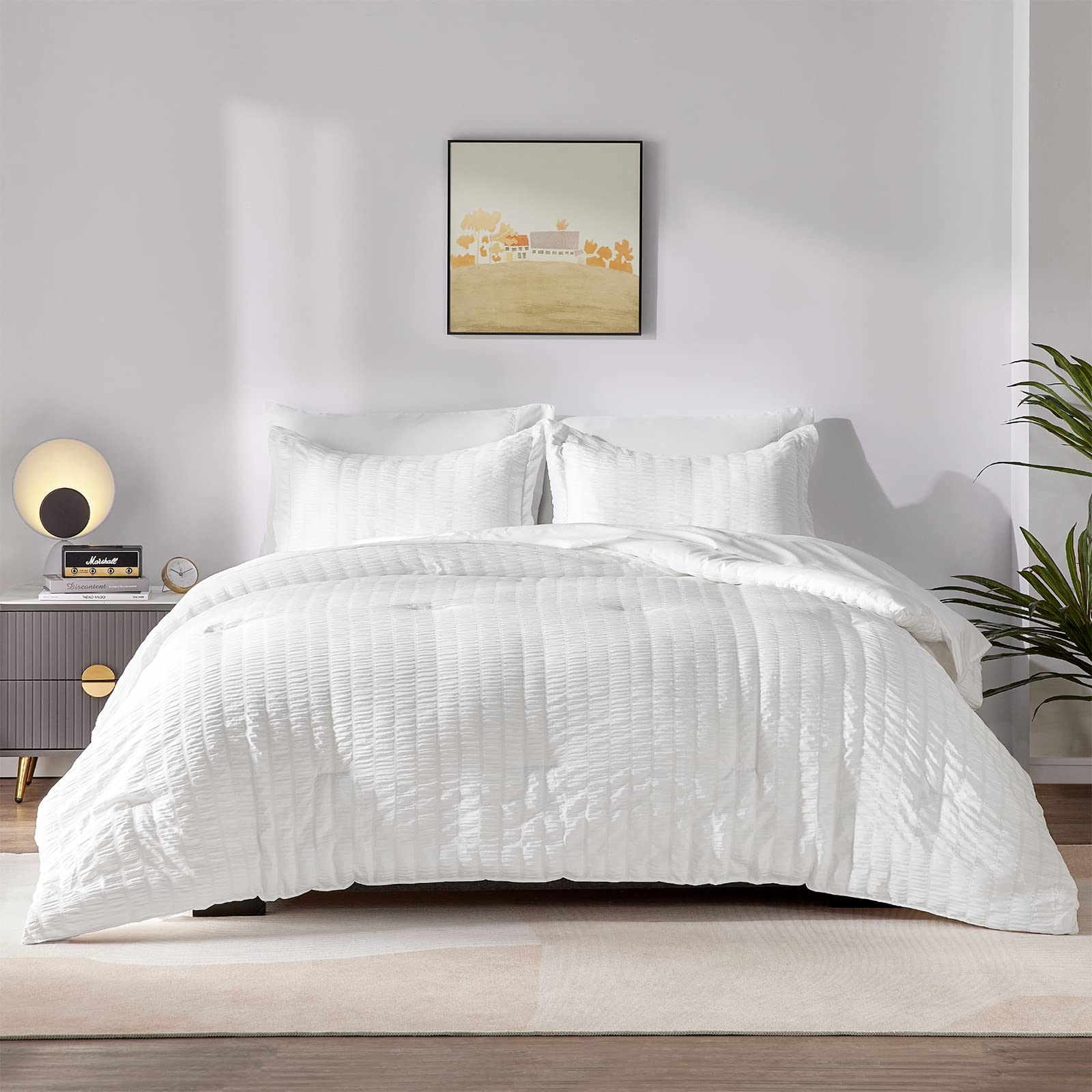 - The complete set utilizes 100% Microfiber. Whole-piece microfiber fill in the comforter provides exceptional warmth and coziness. The front side just has the “wrinkled look” and the underside is smooth. Solid stitching for the comforter largely improves its durability, well-preventing bunching, and creates a lightweight quilt for year-round comforts.