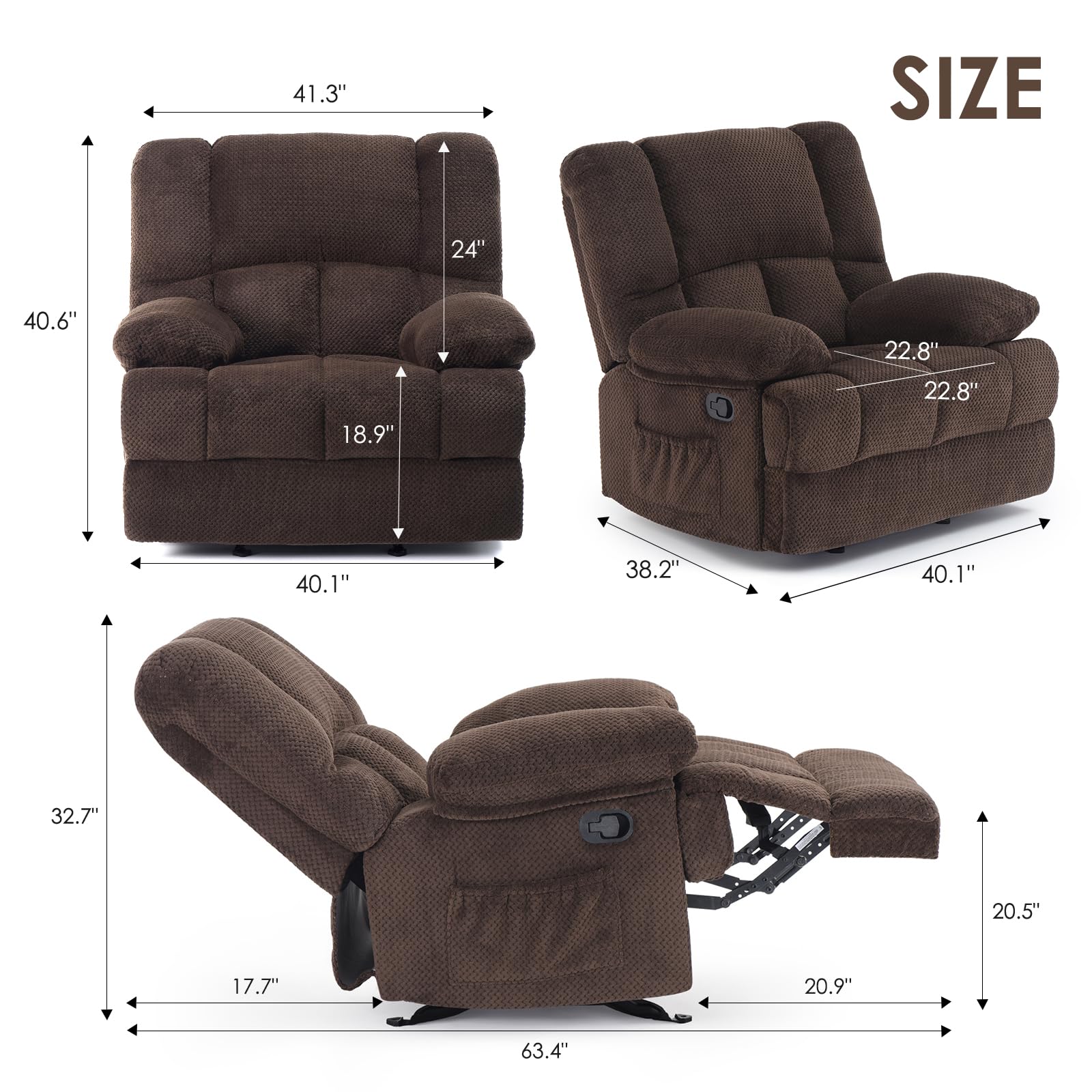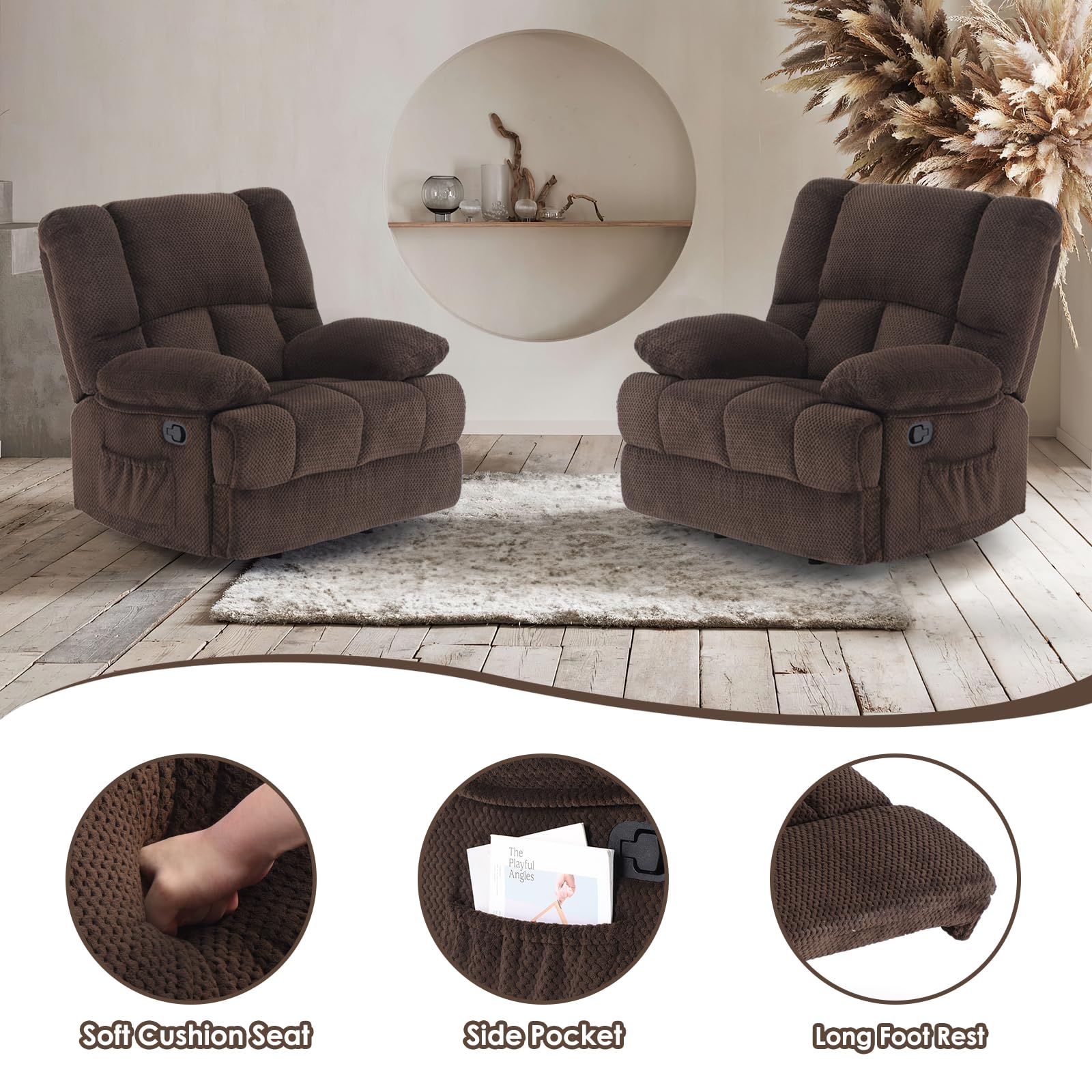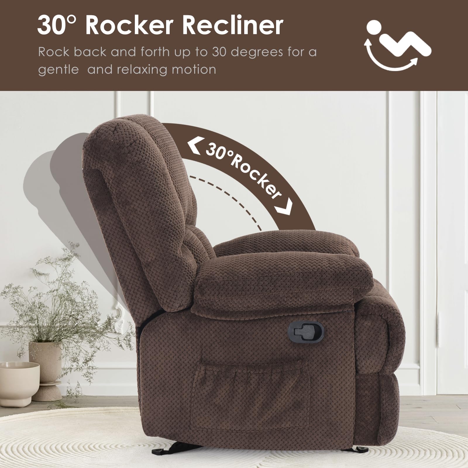 - Rocking Recliner: Classic rocker base provides gentle motion for a soothing experience—perfect for living rooms, reading corners, and bedrooms.