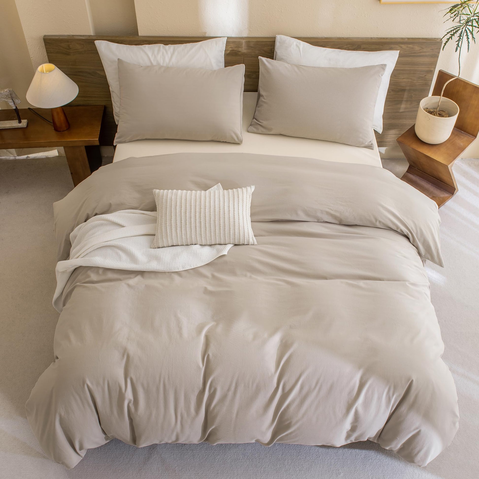 - This solid color comforter set is covered by cotton material and filled with whole-piece superior microfiber. Very soft, comfortable, breathable and long-lasting, providing exceptional warmth. Our linen feel texture bedding comforter set is washed for lived-in softness and naturally wrinkled texture, which is more softer after washing. keeping you comfortable all night.