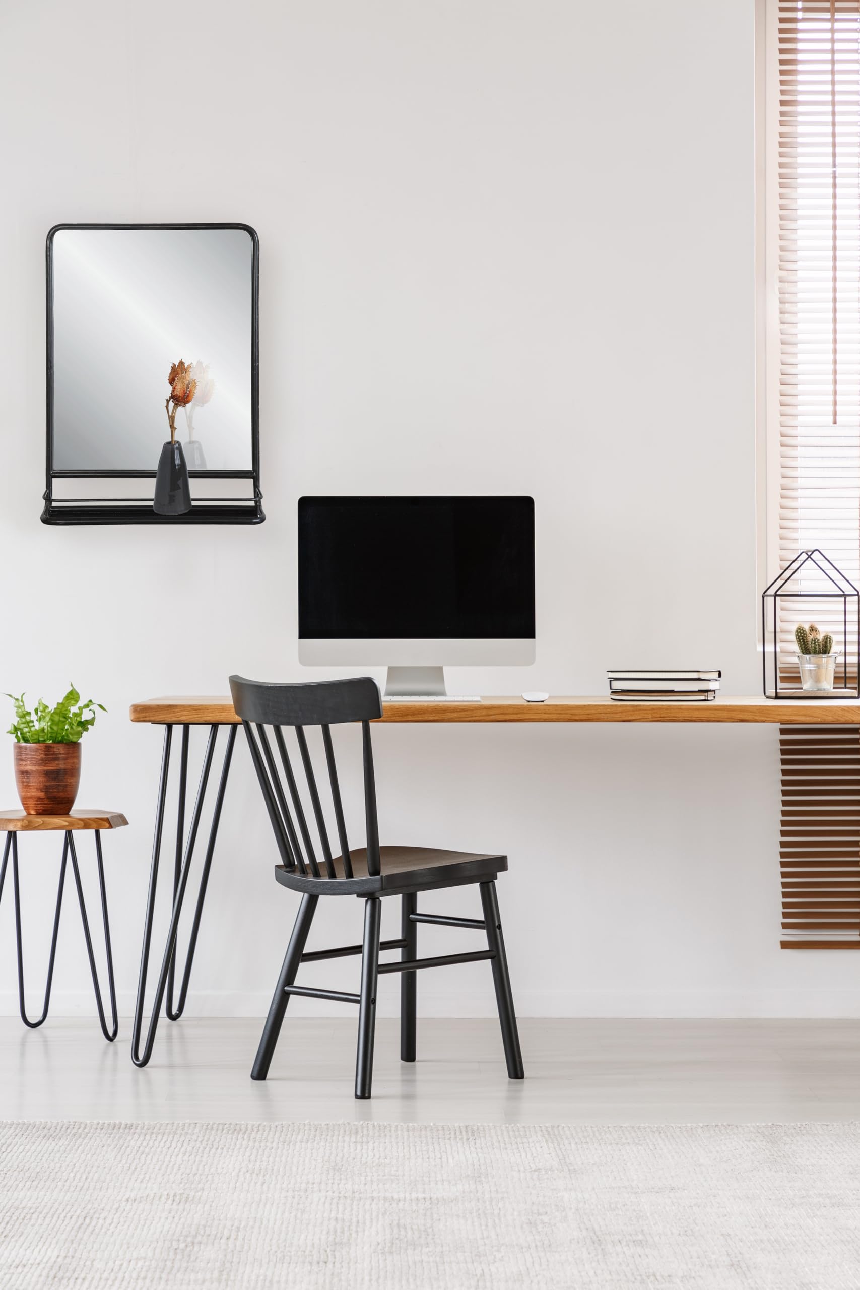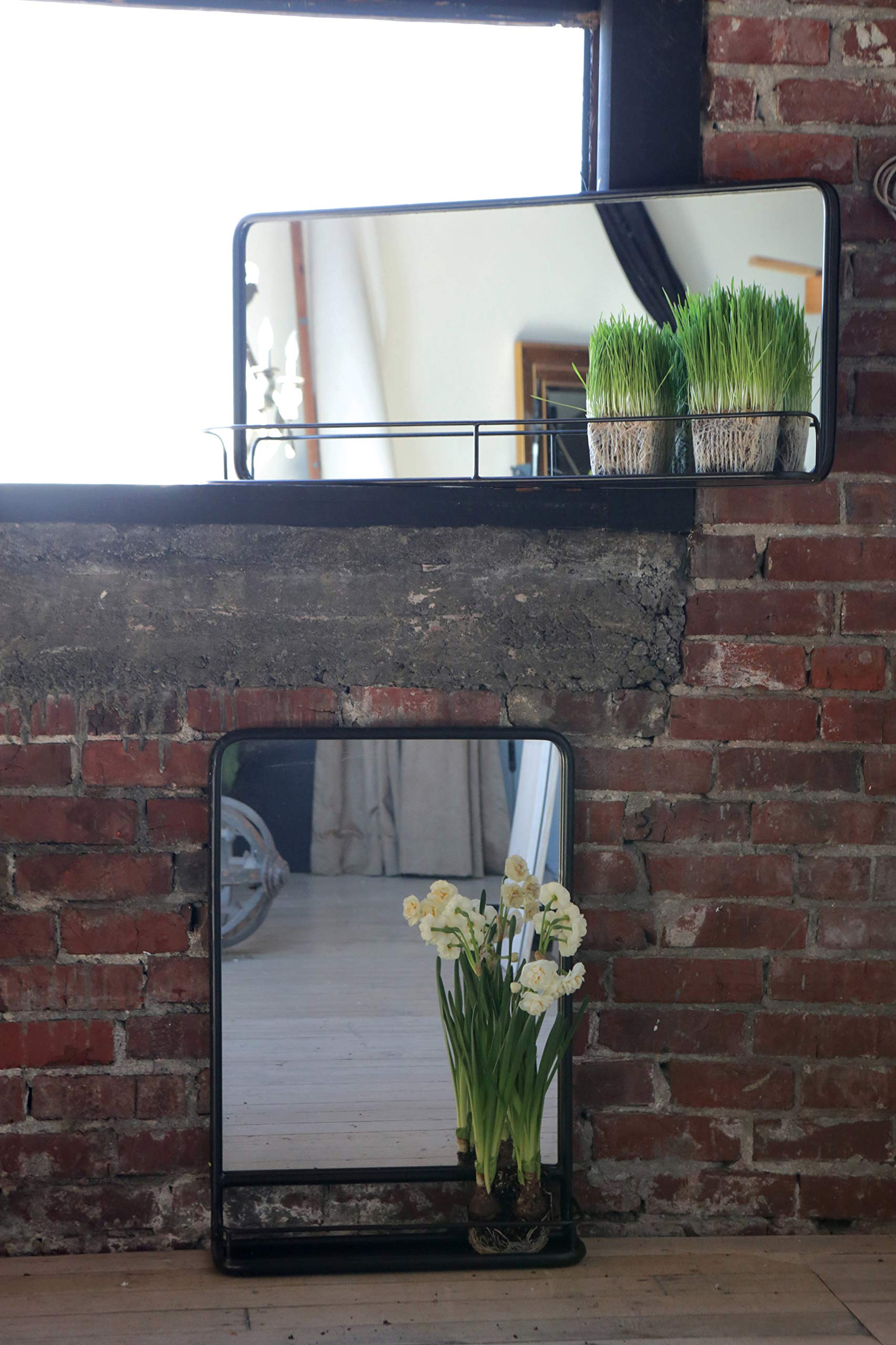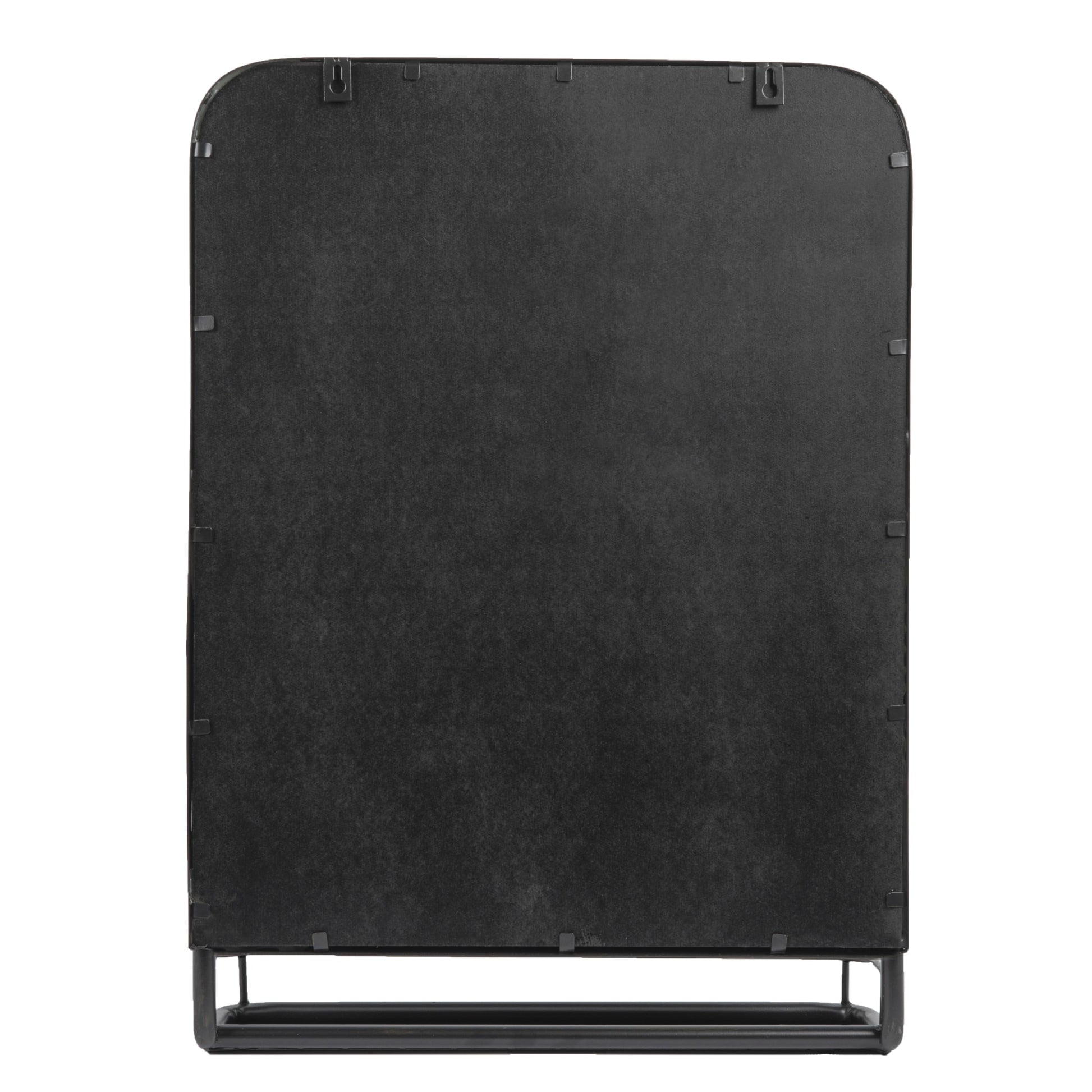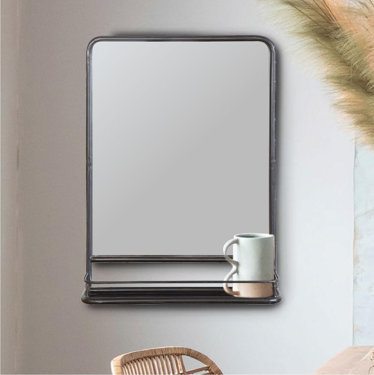- A sleek and contemporary wall mirror that features a black metal frame with an attached shelf