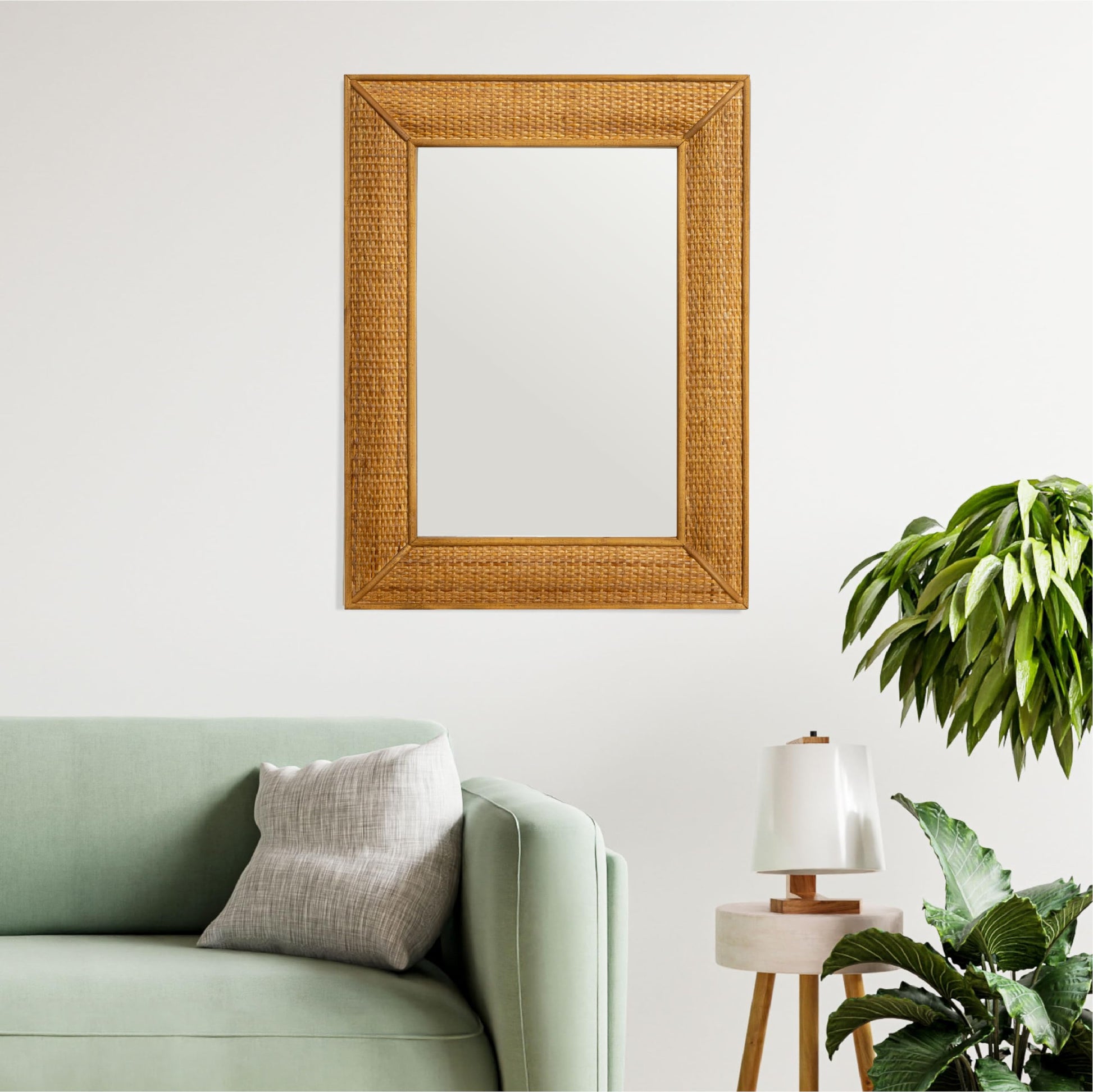 - A beautiful wall mirror with a wood frame and an intricately woven rattan detail in a brown finish