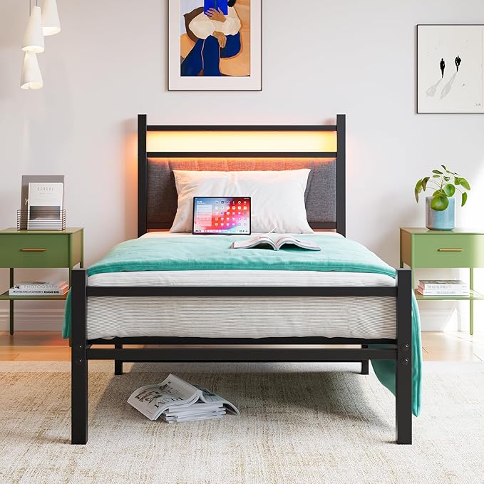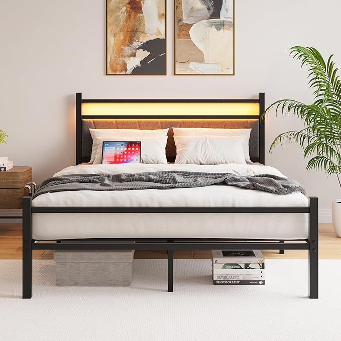 Frame with Upholstered Headboard and Charging Station, LED Lights Bed Frames