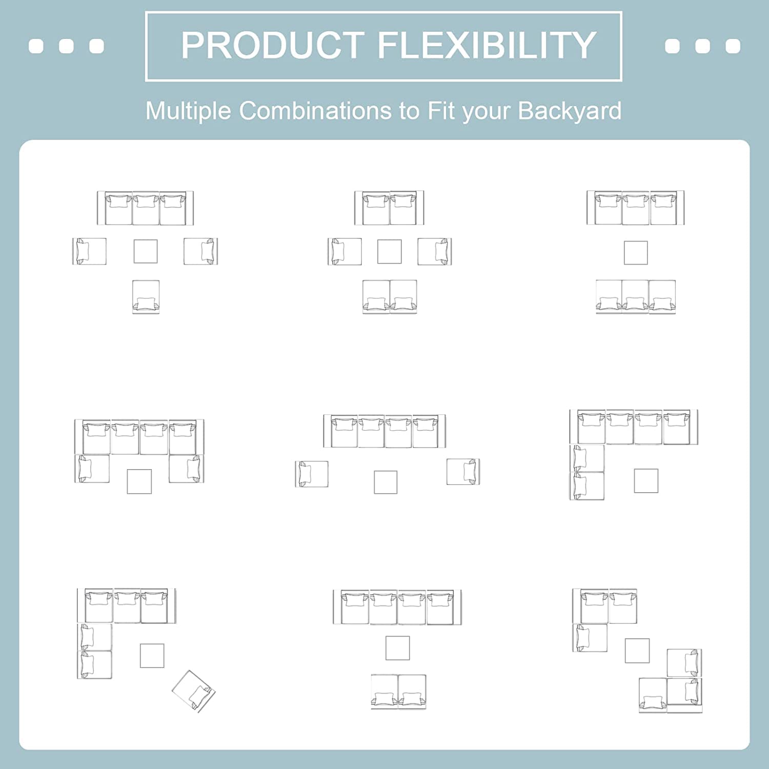 - Flexible Combination This patio sofa sectional set are including, 2 corner chairs, 4 armless chairs, and 1 glass coffee table. This moveable design allows it to adjust a required combination and change to different shapes for seating or lying.