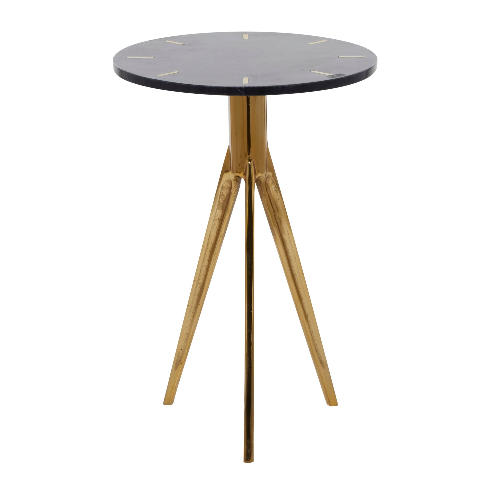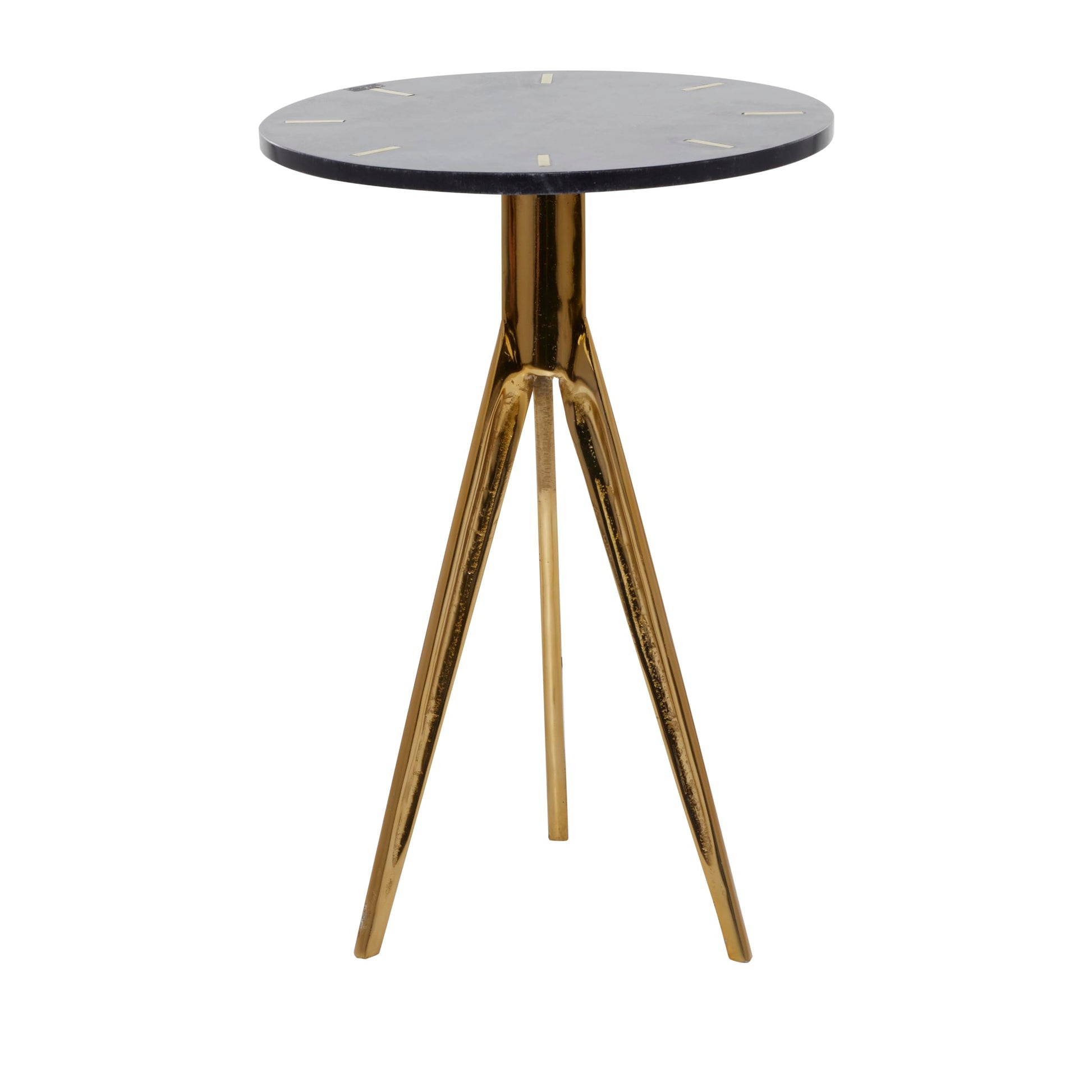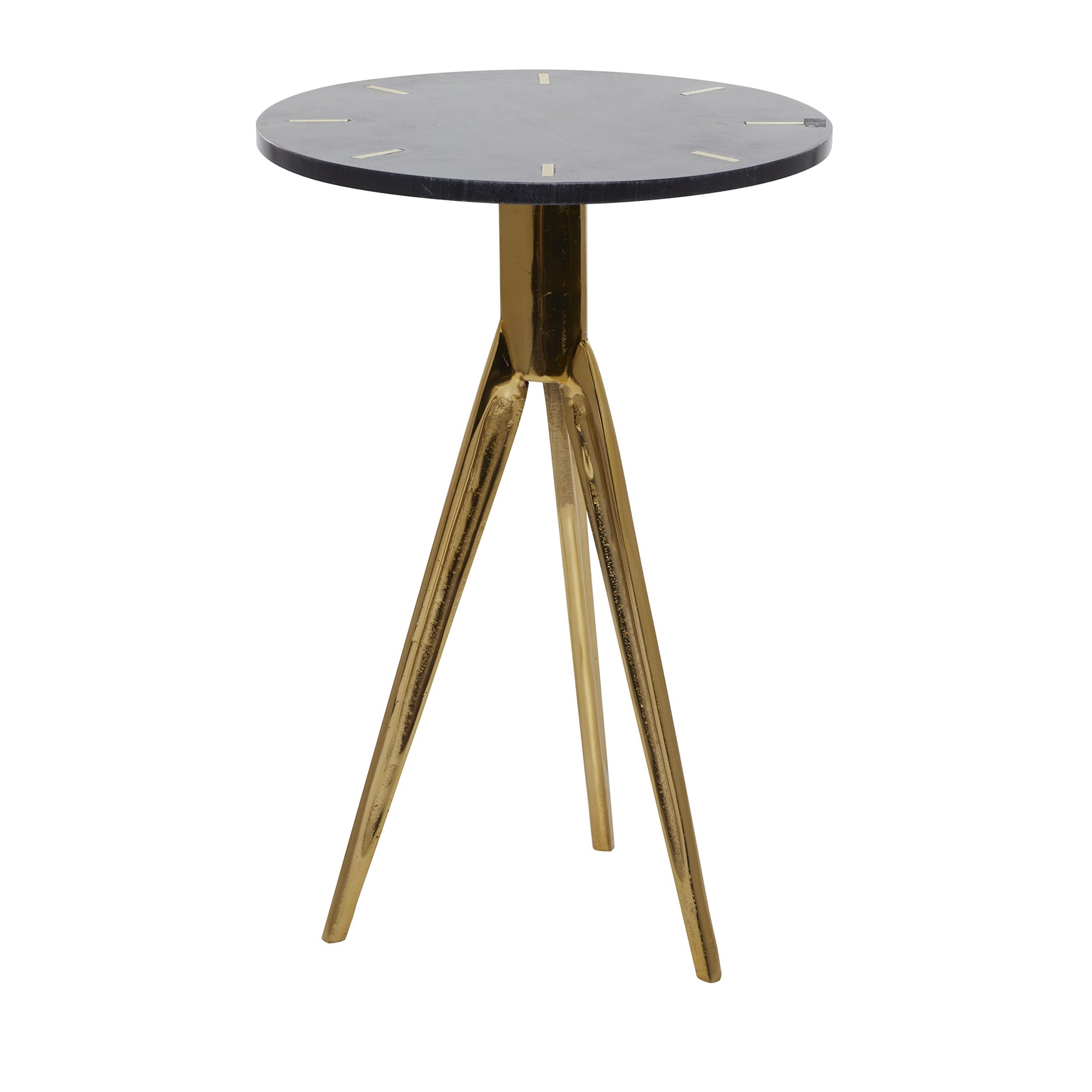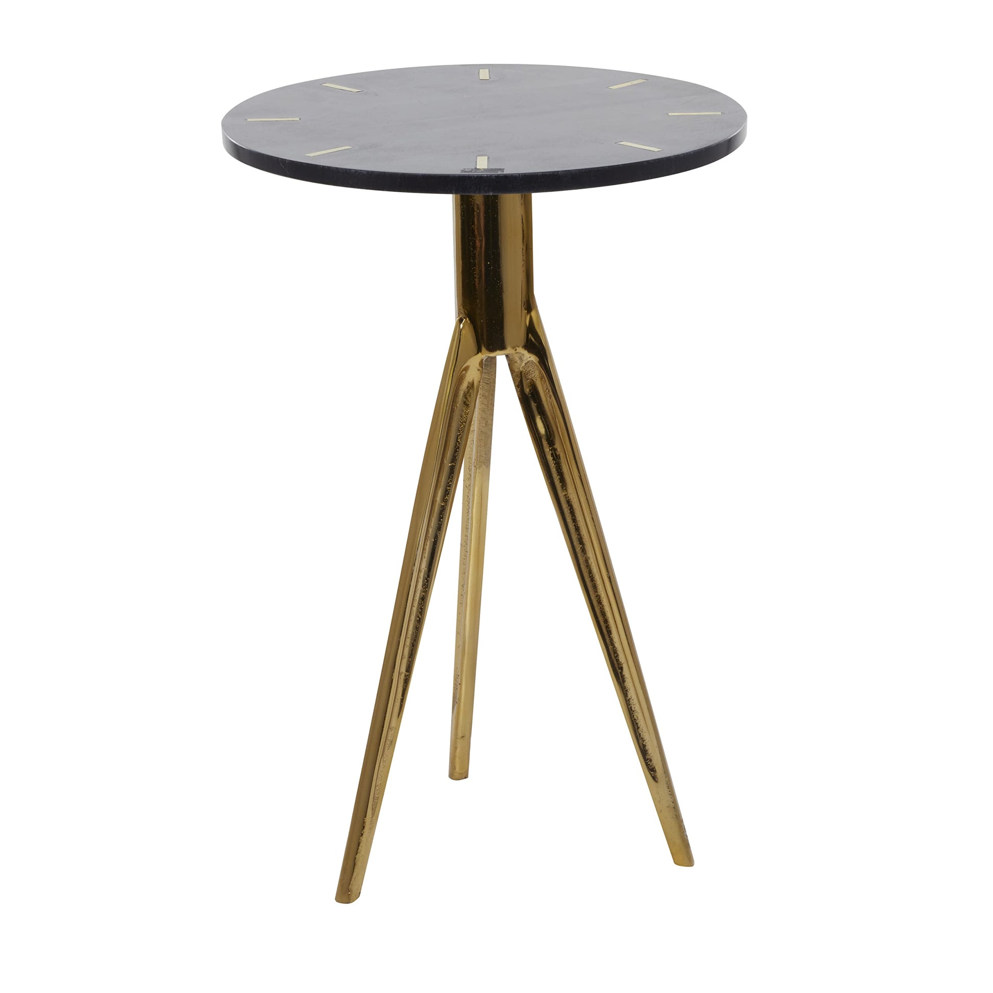 - A medley of black and gold finish lavish this accent table and features a slim top supported with sleek tripod legs showcasing a polished style