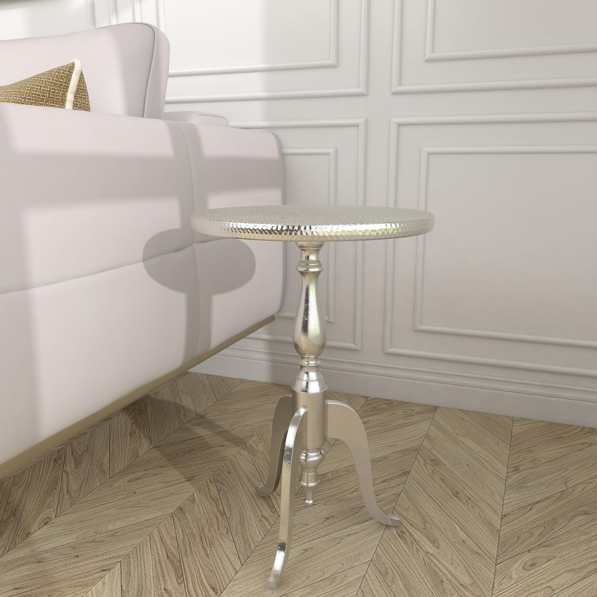 - SILVER LIVING ROOM TABLE: Round table has a turned style and is finished with an eye-catching polished silver that stands out in any space