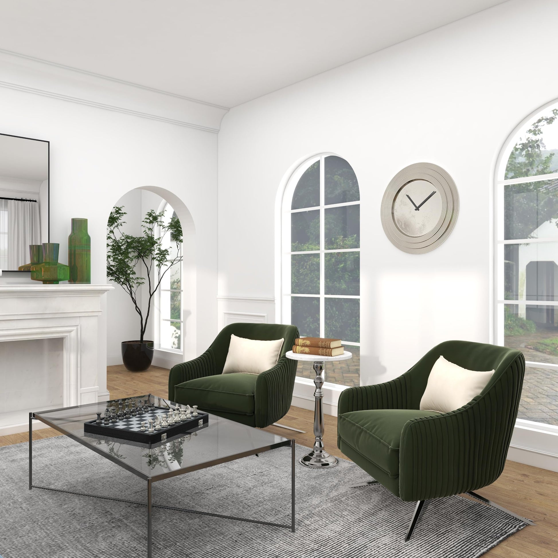 - SILVER LIVING ROOM TABLE: Round table showcases a polished silver finish, complemented by a white and black speckled top, exuding elegance and sophistication