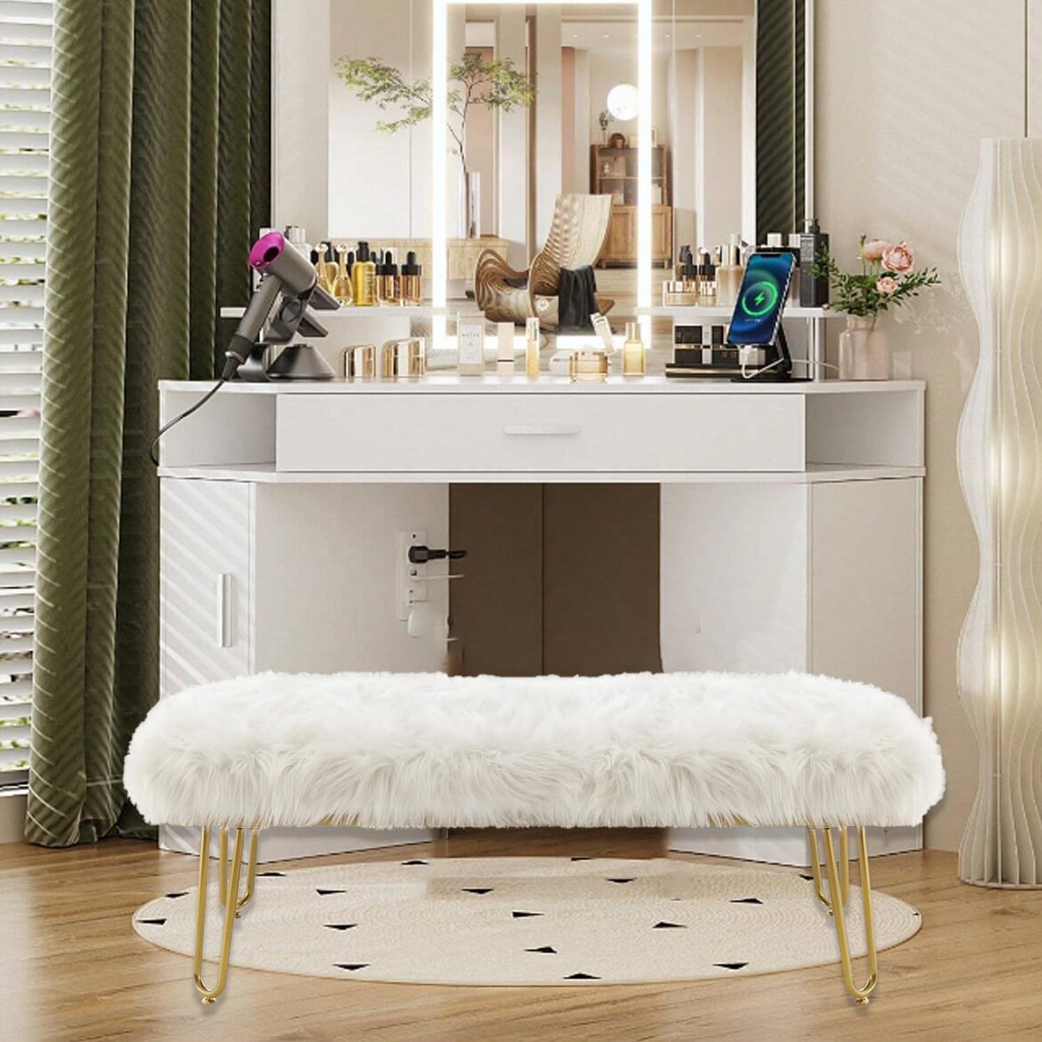 - This modern style ottoman bench benefits from a beautiful white premium plush faux fur design, while its four metal legs not only provide solid support, but also add some industrial style aesthetics. Its addition will give your home a new look