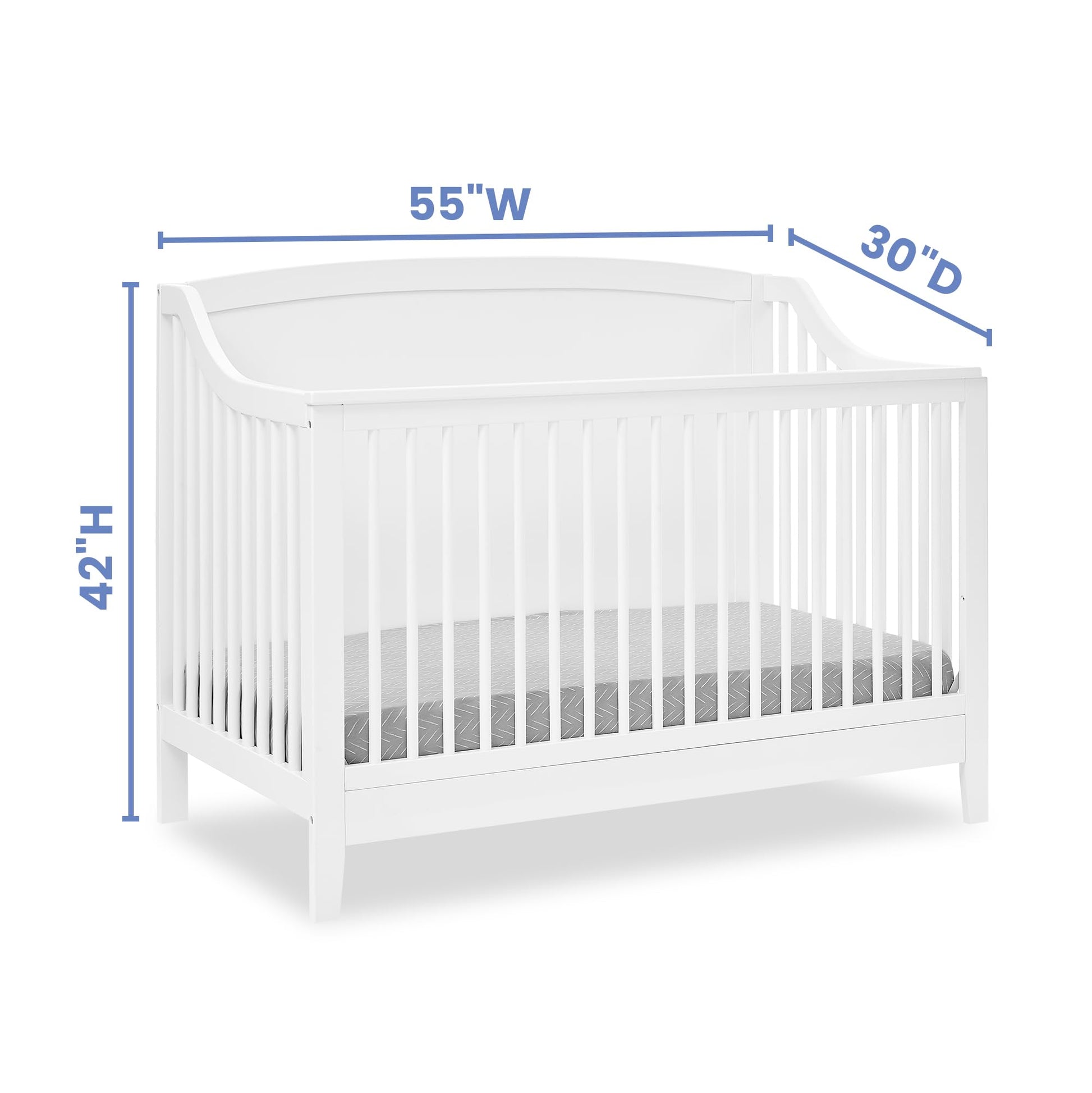- SIZE: Assembled dimensions: 55"W x 30"D x 42"H | ADJUSTABLE HEIGHT: Adjustable height mattress support with 3 convenient positions to grow with your baby | Easy assembly