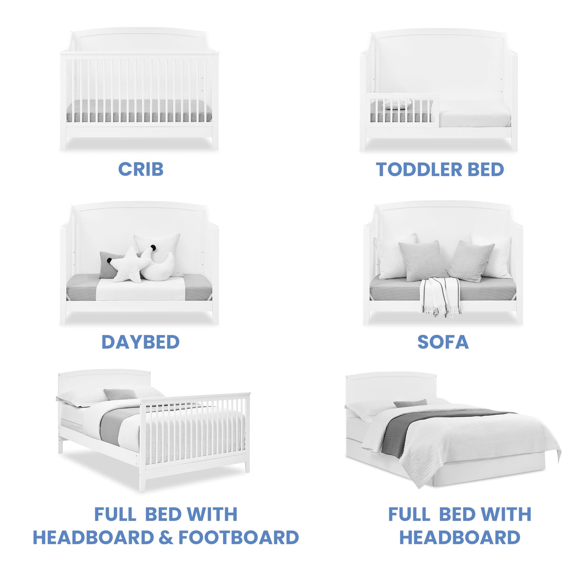 - 6-IN-1 CONVERTIBLE CRIB: Crib converts to toddler bed, daybed, sofa, full size bed with headboard and footboard and full size bed with headboard only (Daybed/Sofa rail included; Toddler Guardrail #W100725, Full Size Bed Rails #0050 or standard full size bed frame for headboard only, sold separately)