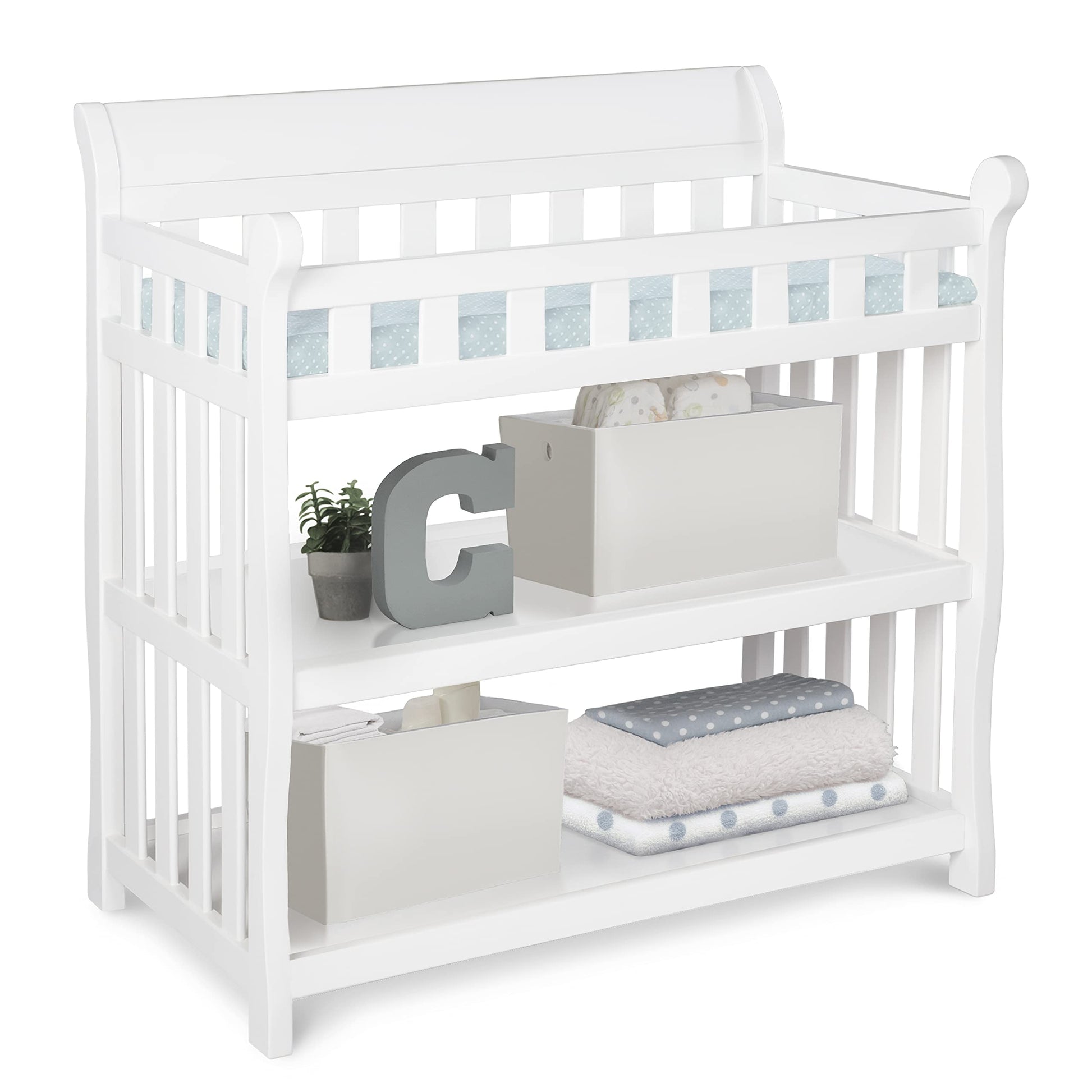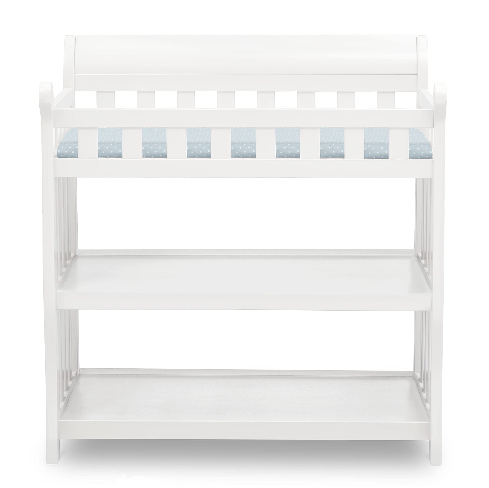 - Contains 2 shelves, safety belt, top safety rails, changing pad