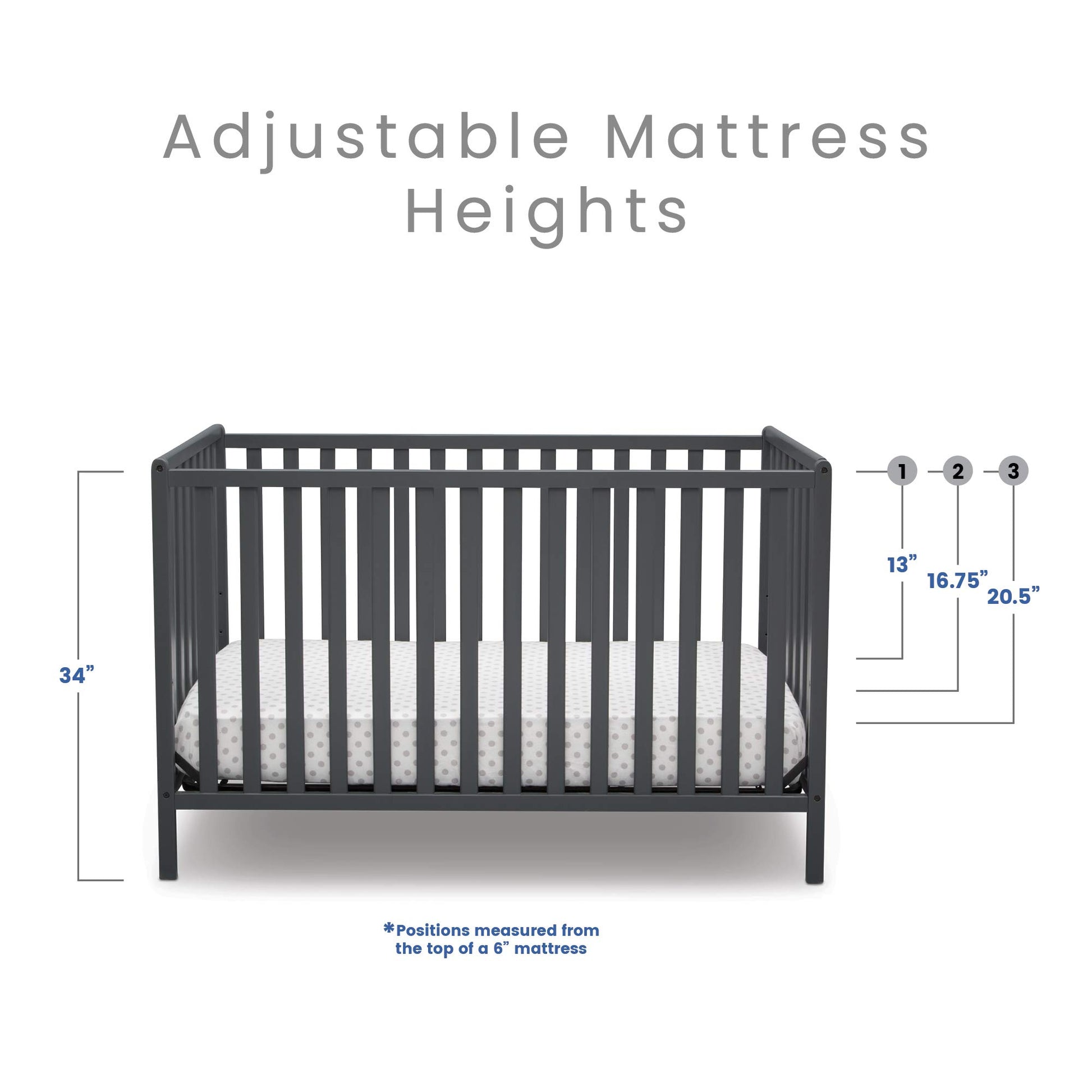 - GROWS WITH BABY: The 3 position mattress height adjustment on this crib allows you to lower the mattress as your baby begins to sit or stand
