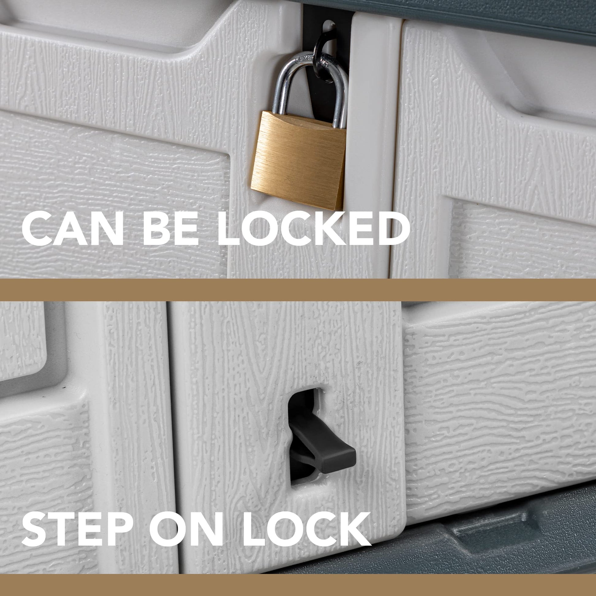 - Double Lock Design Lock hole is reserved at the top of the cabinet, the pin at the bottom can be used for the foot switch without squatting. Two locks ensure that your goods are safe and complete outdoors. The flip supported by a lever makes it convenient for you to store items quickly and easily.