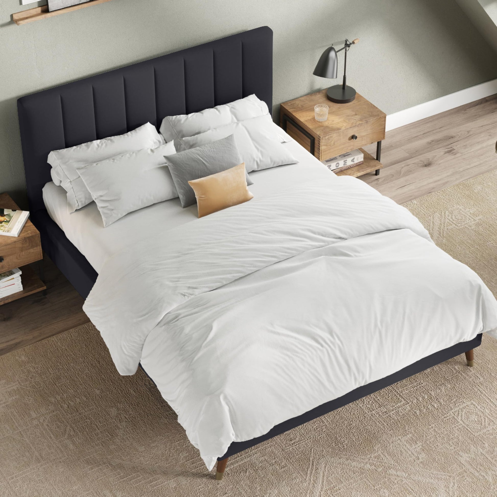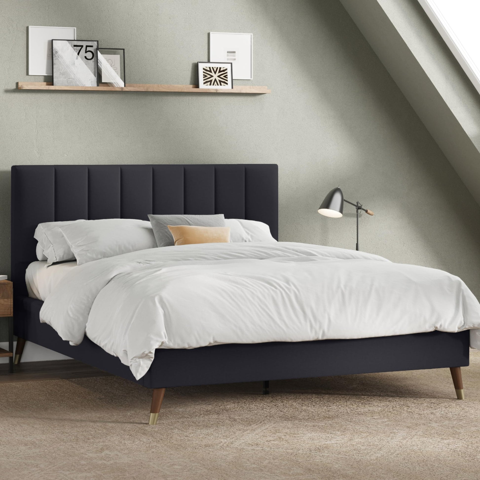 - Queen size platform bed frame in charcoal polyester fabric with tufted vertical channel headboard