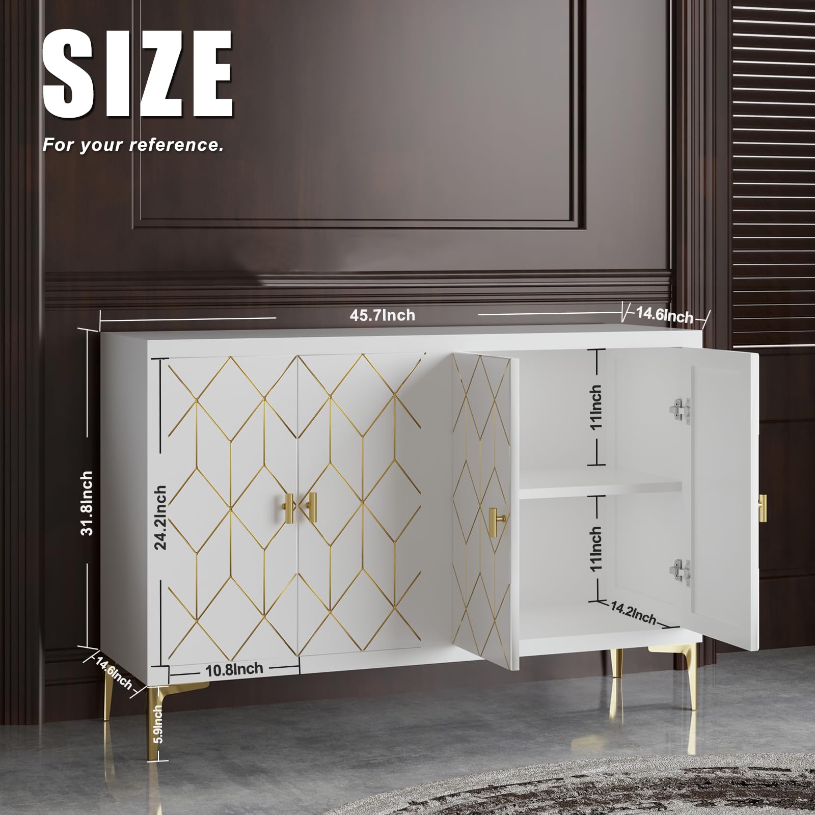 - Our sideboard cabinet introduces a touch of modern classic elegance into your home. Featuring a pristine white finish accented with chic, textured gold lines, it seamlessly blends with various decor styles. This kitchen buffet cabinet not only enhances your living area but also symbolizes sophisticated taste and style.