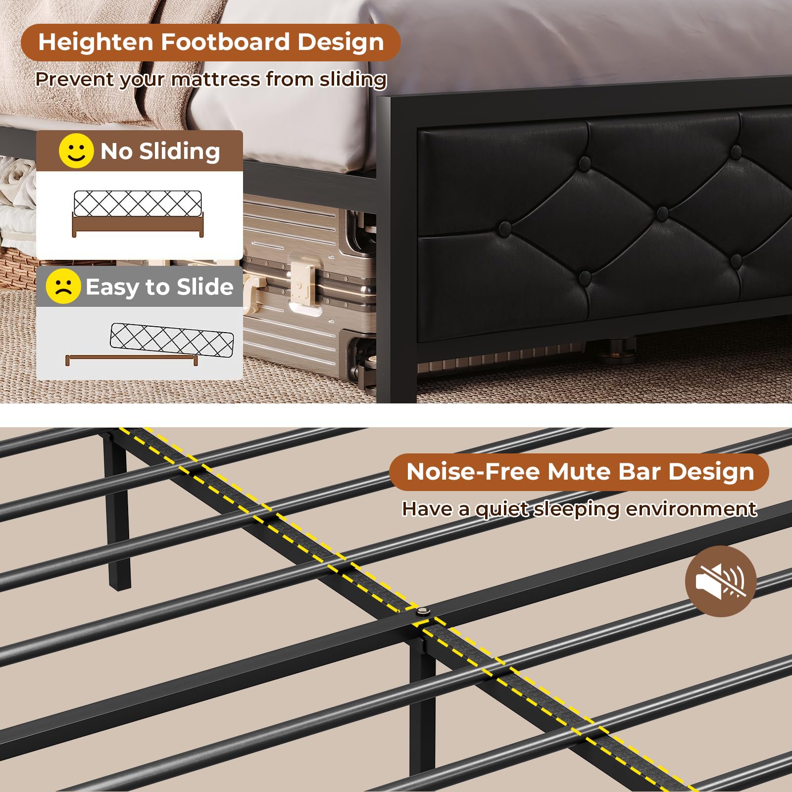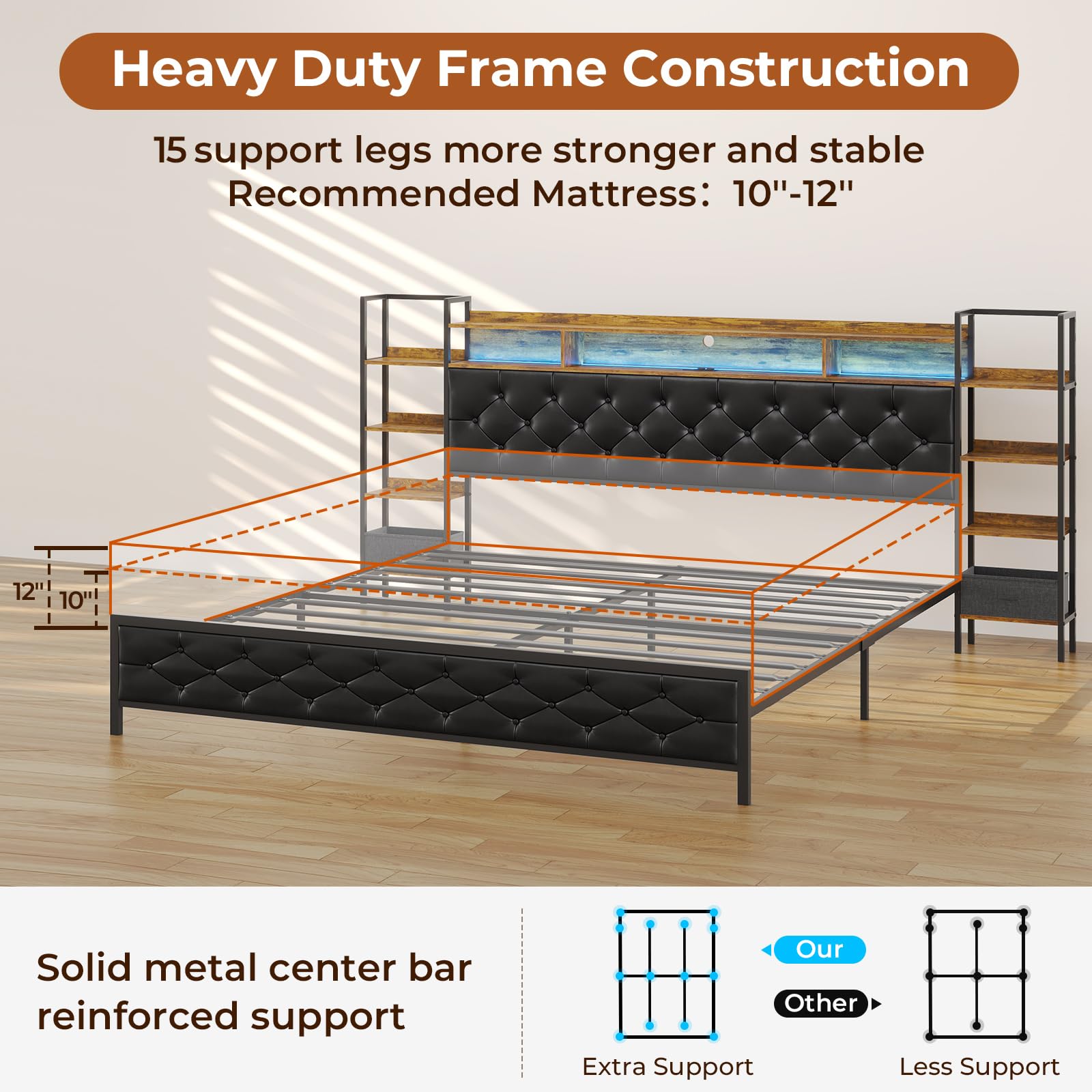 - Wide and Thick Leg Design,sturdy heavy duty metal frame to ensure the led king bed frame stability and create a peaceful sleeping environment.EVA foam material mute bar is pressed on the metal beam,effectively reduces the friction of the steel frame,so dont't need to worry about squeaking when you roll over at midnight.