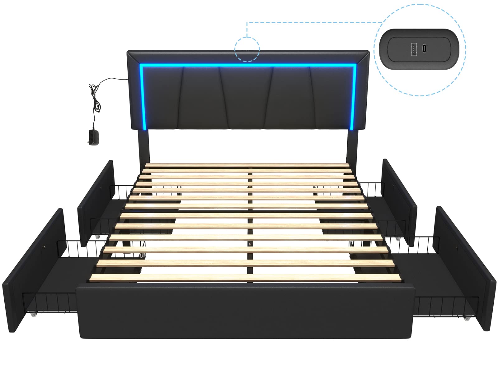 Queen LED Bed Frame with 4 Drawers and USB Ports Modern Faux Leather Upholstered
