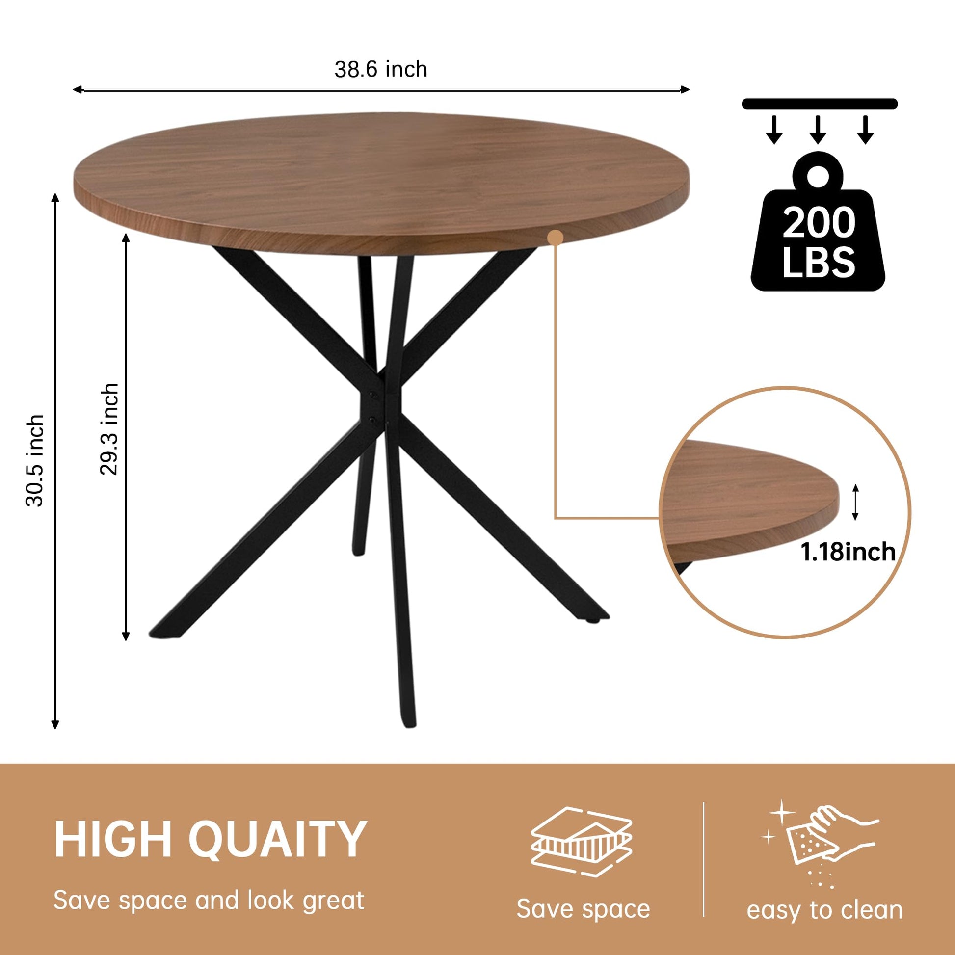 - The round dining table only includes one table, not the chairs; the round kitchen dining table adopts a mid-century modern appearance design, with a unique combination of high-quality MDF material and walnut wood grain tabletop design. The 39" X 39" wide tabletop provides space for tableware, potted plants, and delicious food objects, etc.