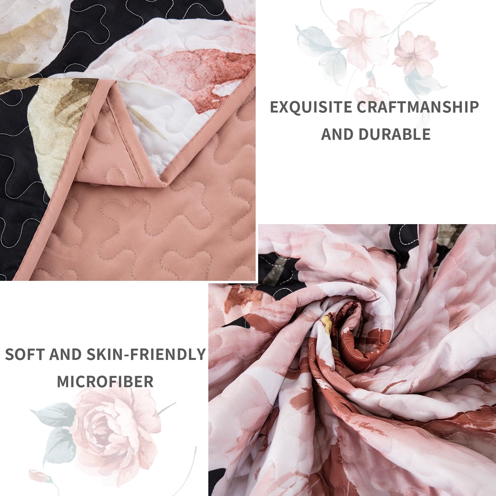 - The black and pink floral quilt set is made of premium microfiber, breathable and super soft. Exquisite and strong quilting stitches make the quilt more durable. Create a relaxing and comfortable sleep experience for you.