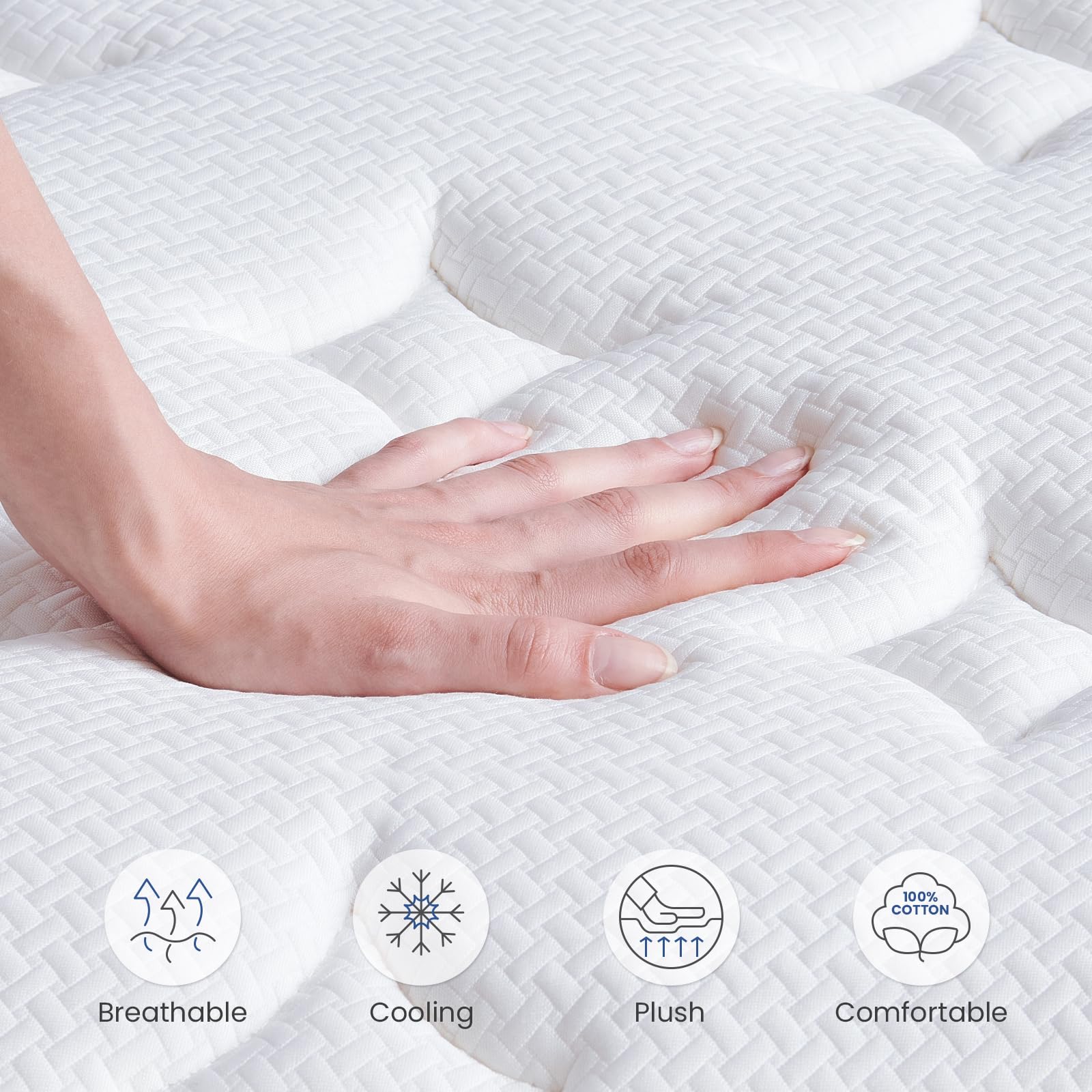 - 𝐁𝐫𝐞𝐚𝐭𝐡𝐚𝐛𝐥𝐞 𝐚𝐧𝐝 𝐂𝐨𝐨𝐥𝐢𝐧𝐠(𝟒-𝐟𝐨𝐥𝐝 𝐜𝐨𝐨𝐥𝐢𝐧𝐠 𝐠𝐮𝐚𝐫𝐚𝐧𝐭𝐞𝐞): This hybrid mattress is designed with gel memory foam that is ventilated and breathable, indIvidual pocket spring enhence air circulation. The woven mesh design and the high-quality knit fabric provides outstanding breathability, keeping you dry and comfortable, bring more cooling to you.