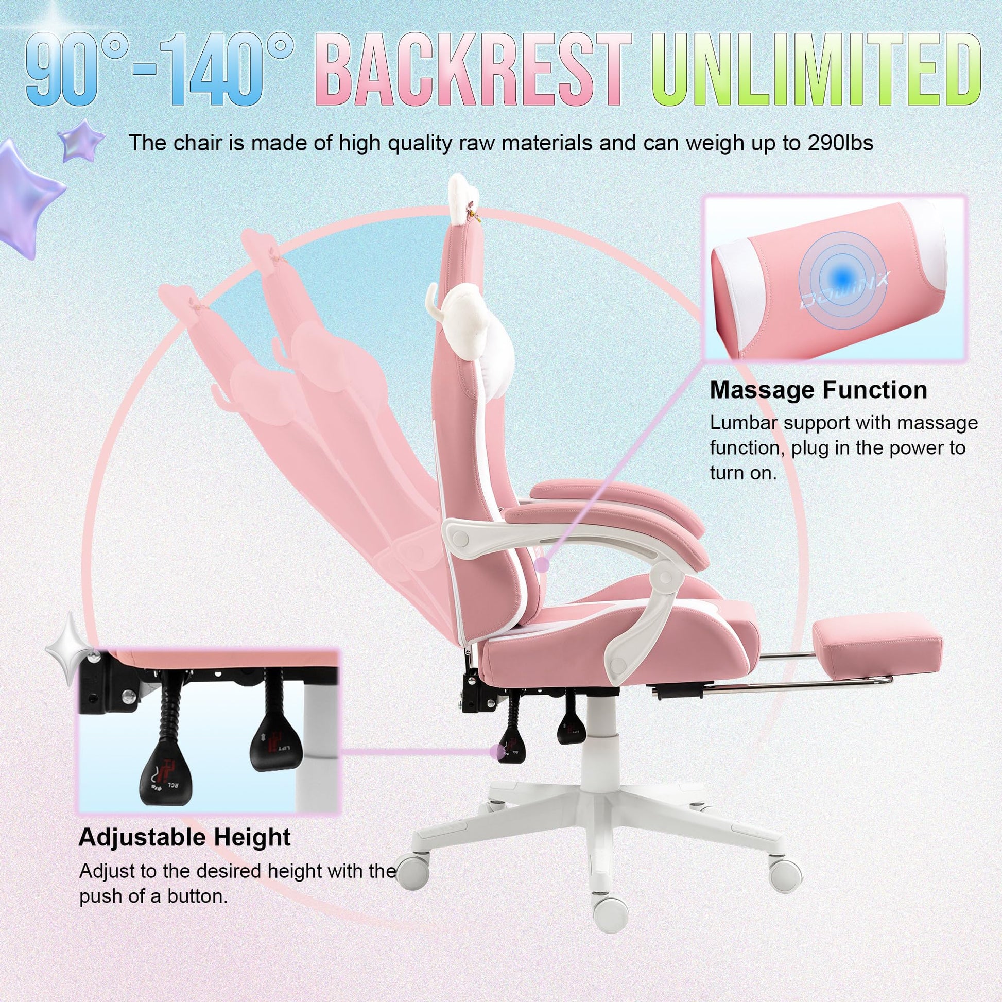 Gaming Chair Cute with Cat Ears and Massage Lumbar Support