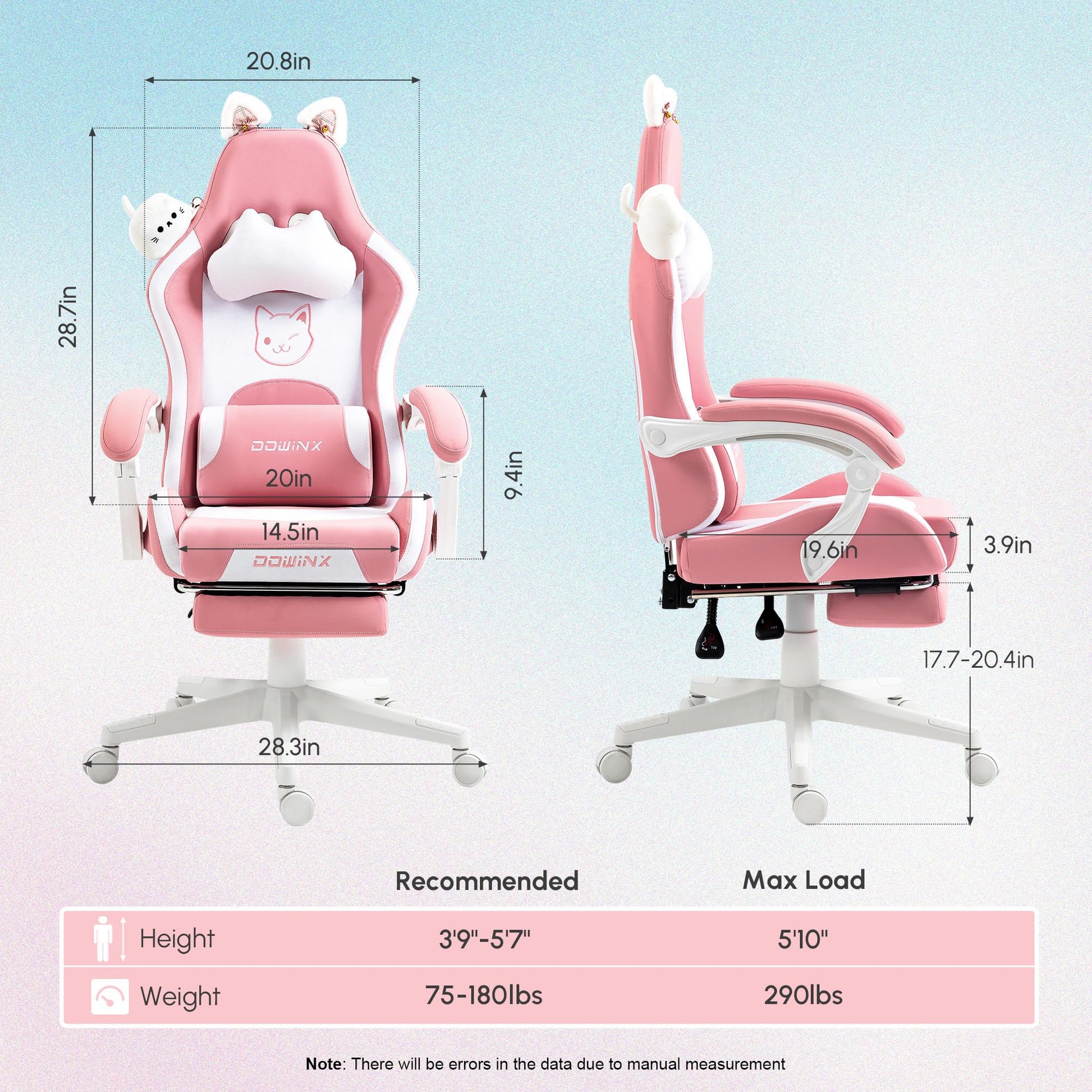 - Next Level Cuteness: What truly sets this gaming chair apart are the endearing cat ears perched on the top corners of the chair's backrest, cat-shaped headrest, and cat doll. These whimsical accents add a delightful touch of playfulness and create an instant connection with anyone who lays eyes upon them. The cat ears and doll are removable and can be replaced with your favorite decorations.