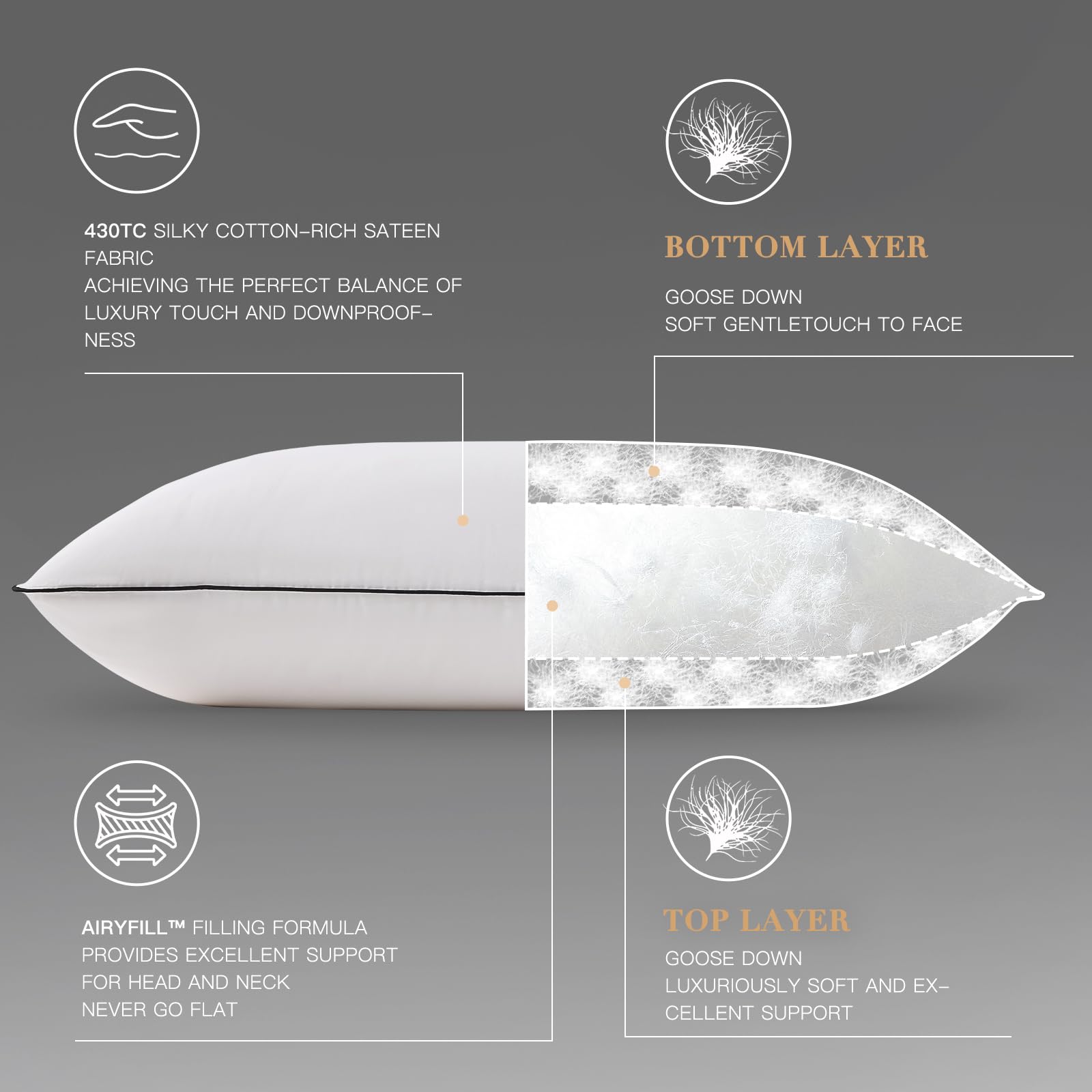 - 【Luxury Hotel Collection Down Pillow】: This pillow boasts a three-layer design inspired by top global hotels. The top and bottom layers feature premium Down feathers meticulously chosen for their superior softness and free from any quills. Sandwiched between them, the middle layer features our exclusive Airyfil blend for optimal neck support and a gentle cradle. Ideal for side, back, and stomach sleepers, ensuring a restful, luxurious night's sleep.