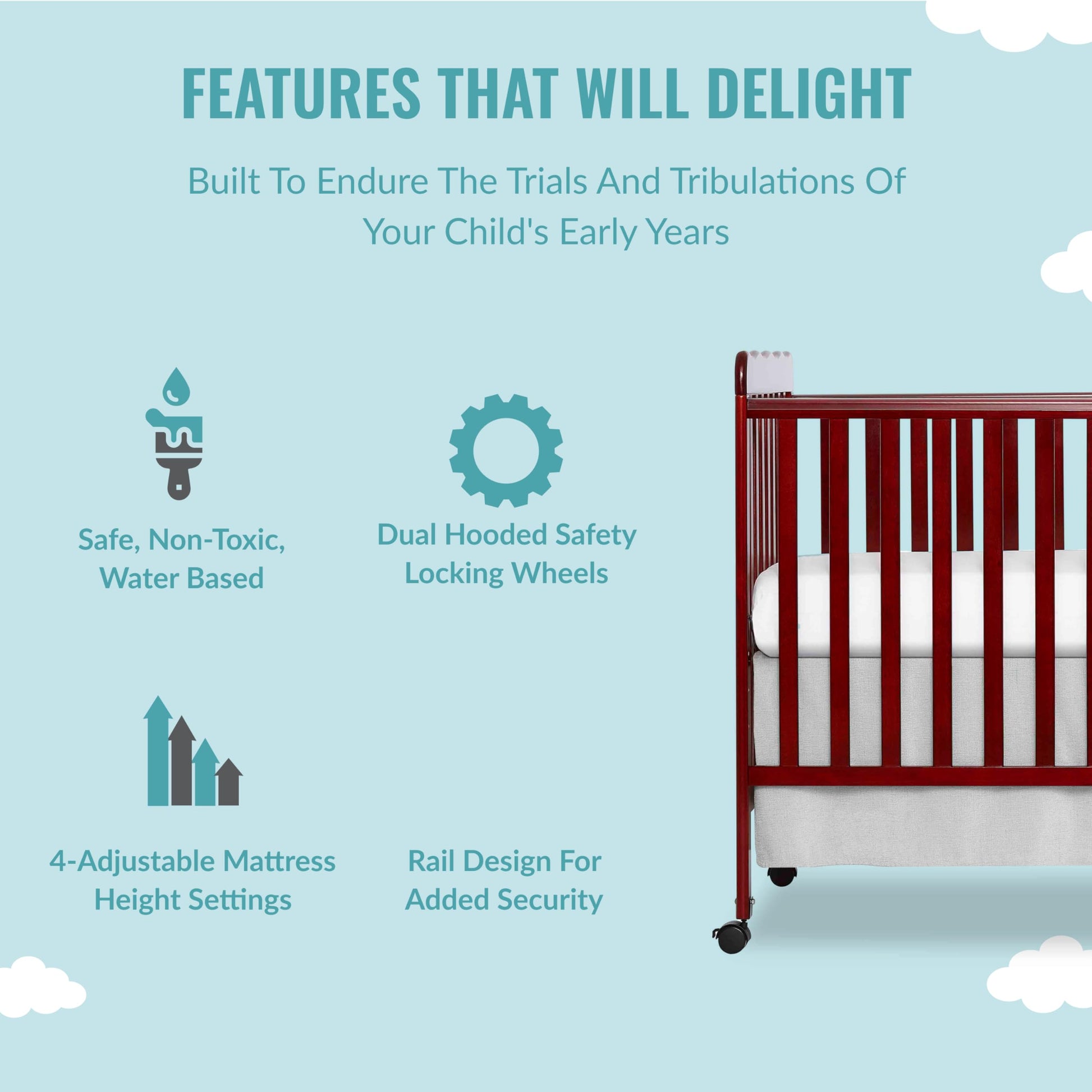- FUNCTIONAL FEATURES: With 4 mattress height positions, the Carson Classic can be adjusted according to the age of your baby. It comes with a teething rail and also has dual hooded, safety locking wheels for easy mobility in those early years.