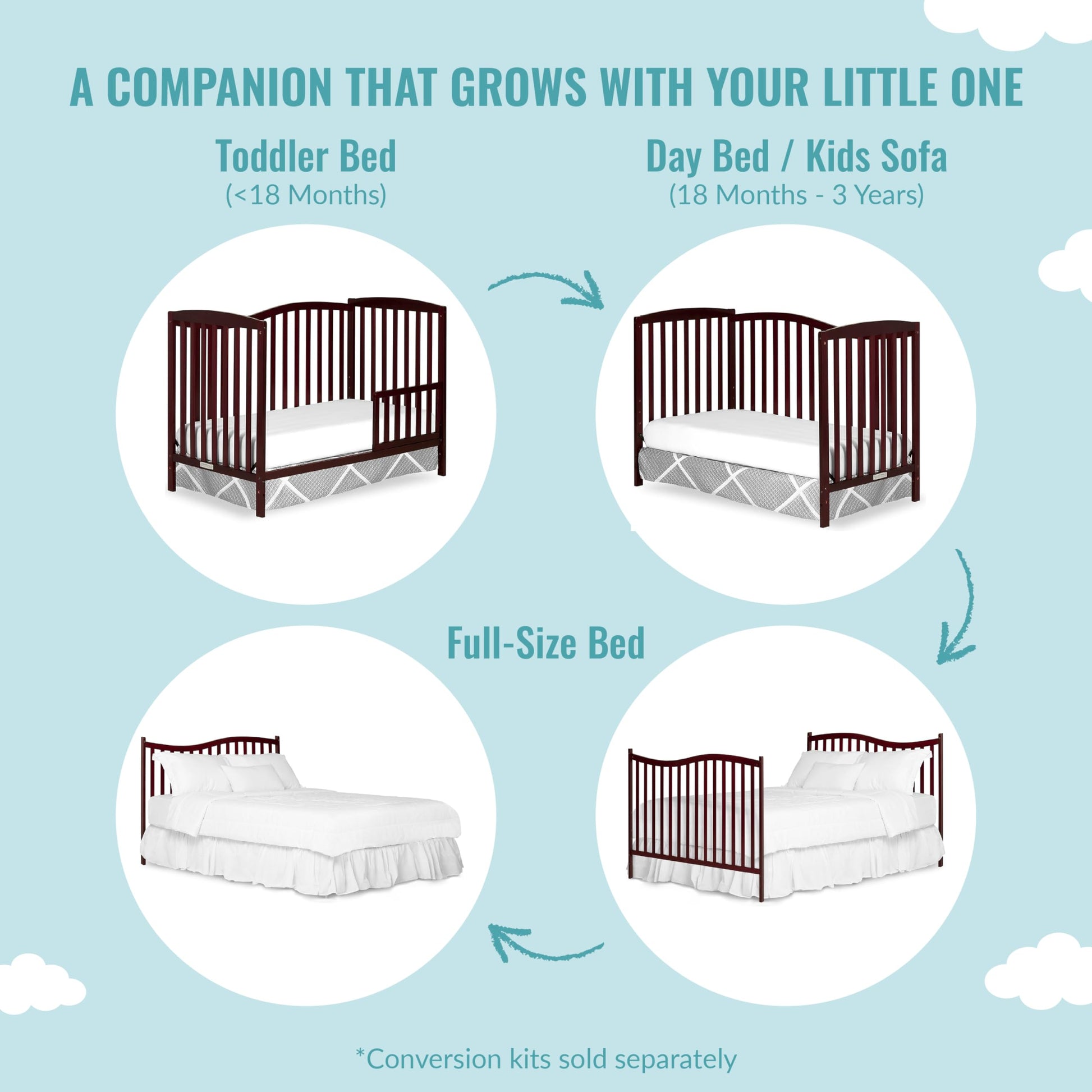 - 5-IN-1 CONVERTIBILITY: The graceful Chelsea keeps pace with your child,converting into a comfy toddler bed, daybed and full size bed as your child grows (toddler guardrail, stabilizer, full size rail and bed frame sold separately)