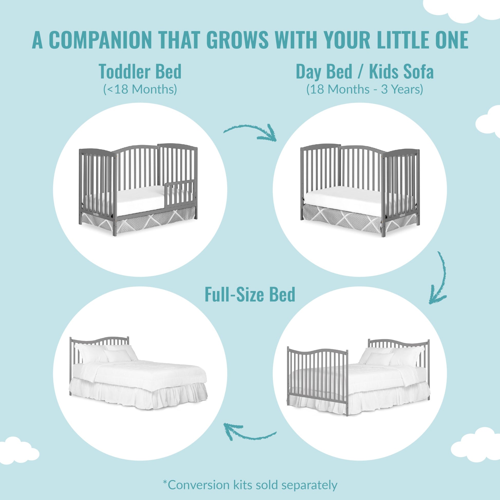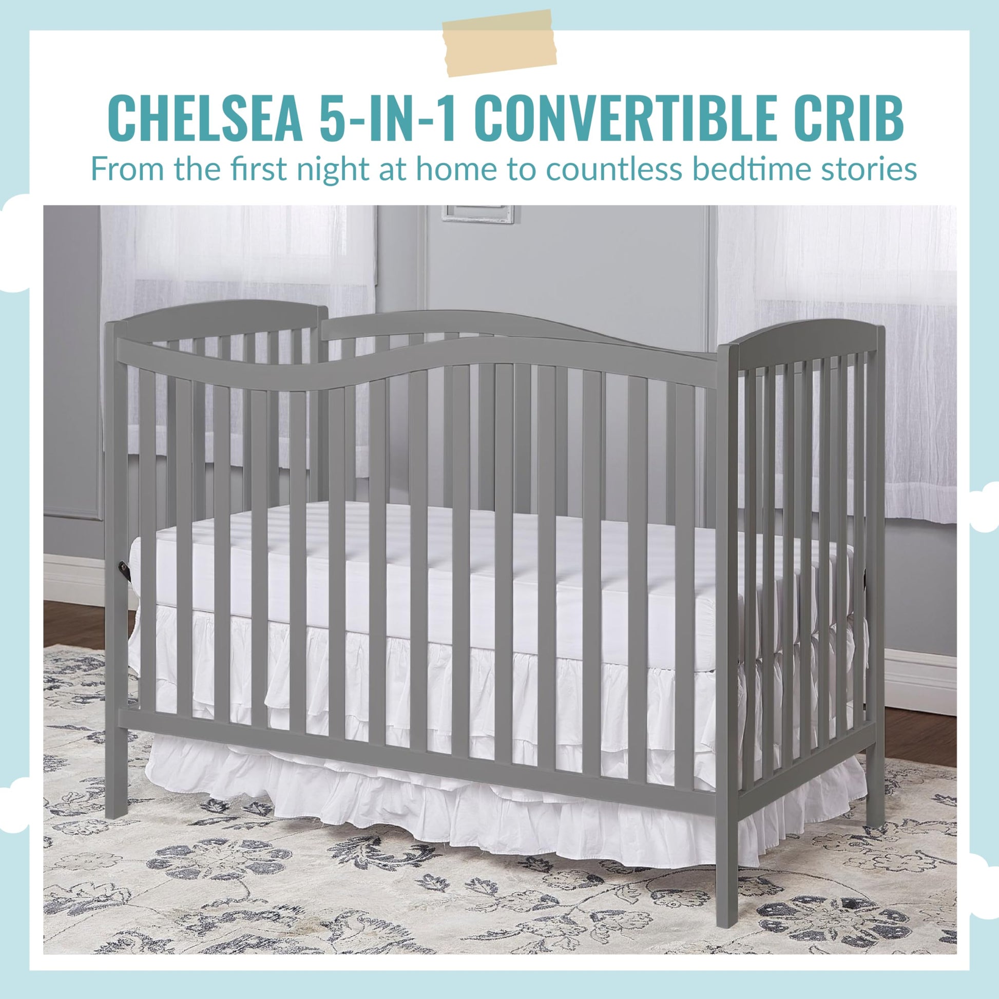 - 5-IN-1 CONVERTIBILITY: The graceful Chelsea keeps pace with your child, converting into a comfortable toddler bed, daybed and full size bed as your child grows (toddler guardrail, stabilizer, full size rail and bed frame sold separately)