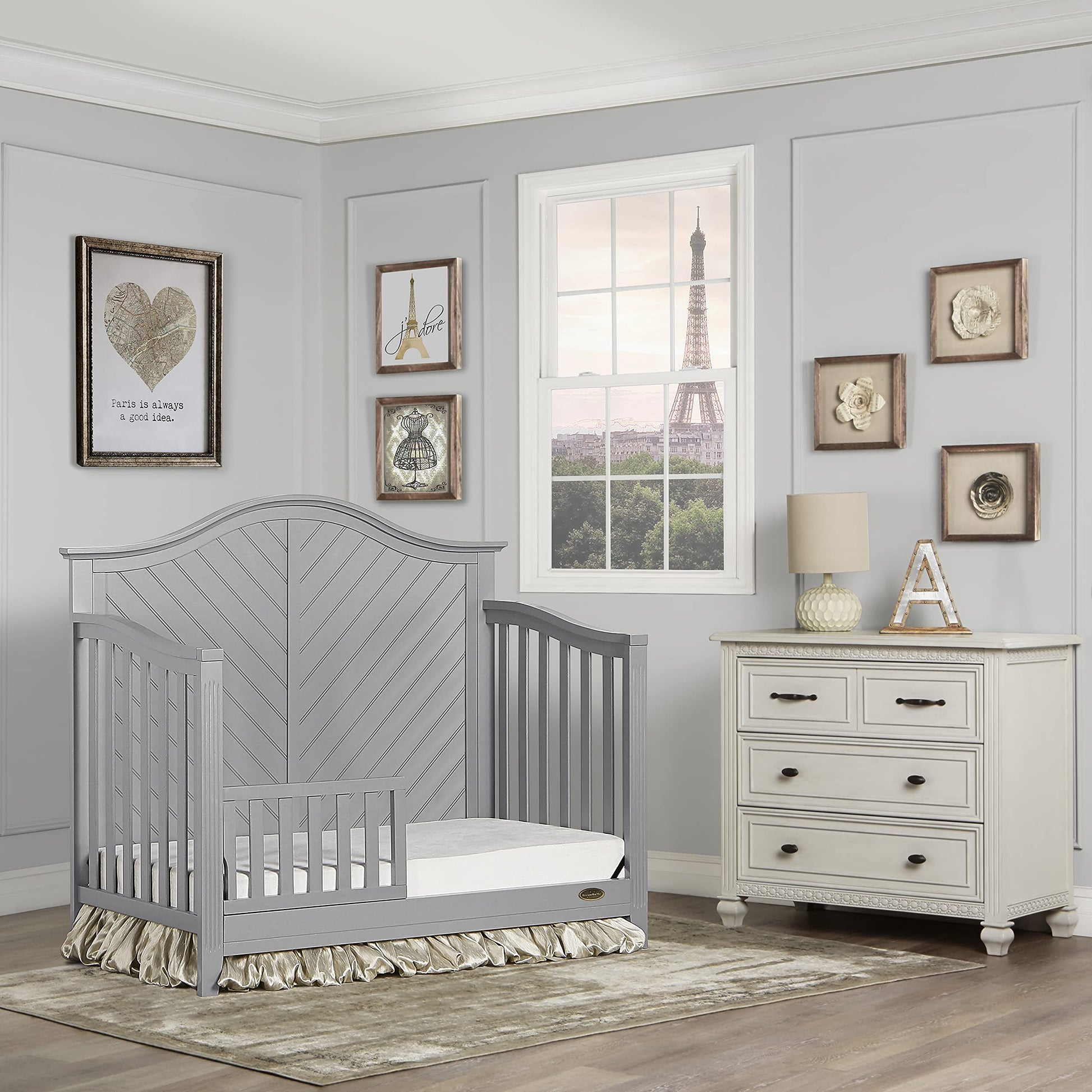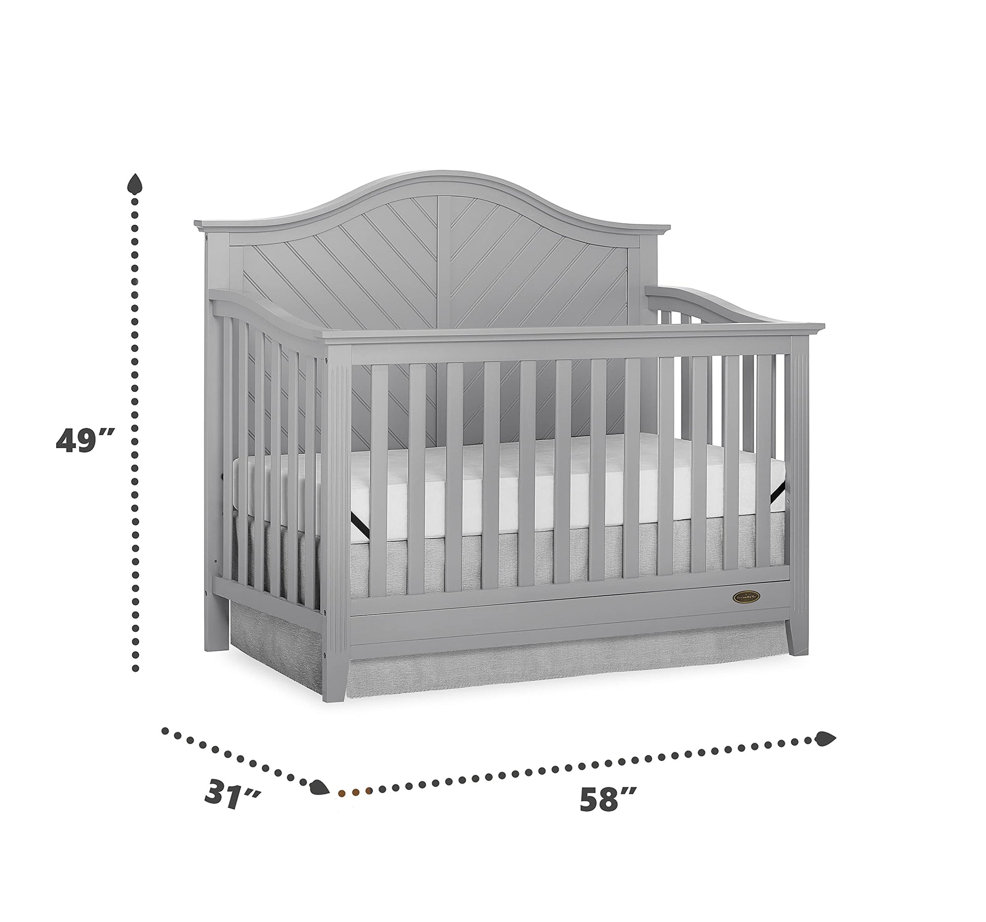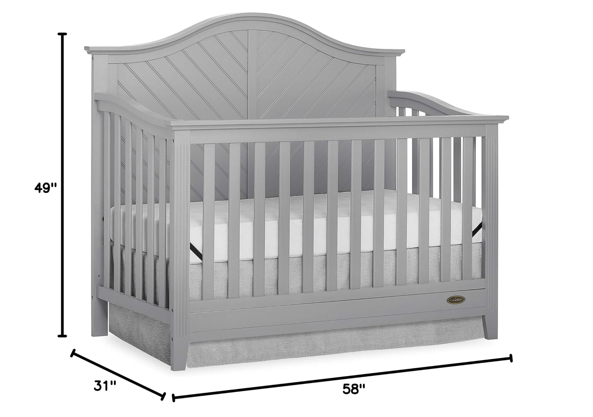 Details: The Ella 5-in 1 Convertible Crib is a durable investment that ages gracefully with your child, making it a go-to option for today’s stylish parents.Elegant and safe, it keeps pace with your child, transitioning into a toddler and daybed (conversion kit sold separately). The back panel converts effortlessly into a full-size headboard and with the addition of a bed frame (sold separately), use it as a full-size bed. Its steel mattress platform has the convenience of 4 mattress height positions, and can be adjusted according to the age of your baby.Built of durable, sustainable and renewable New Zealand pinewood, its timeless silhouette fits perfectly into any nursery or growing child’s room decor. It features a bell shaped full panel headboard and oblique inset design, giving it a classical touch. Available in four smart finishes, mix and match to create a dreamy nursery! All our cribs are designed with a focus on safety, are JPMA certified and meet all applicable ASTM/CPSC standards. All tools for assembly included. It measures 58Lx31Wx49H inches; maximum weight capacity is 50 lbs. For the best fit, we recommend any Dream on Me/Evolur standard, full-size, non-toxic, Greenguard Gold certified crib mattress (sold separately).