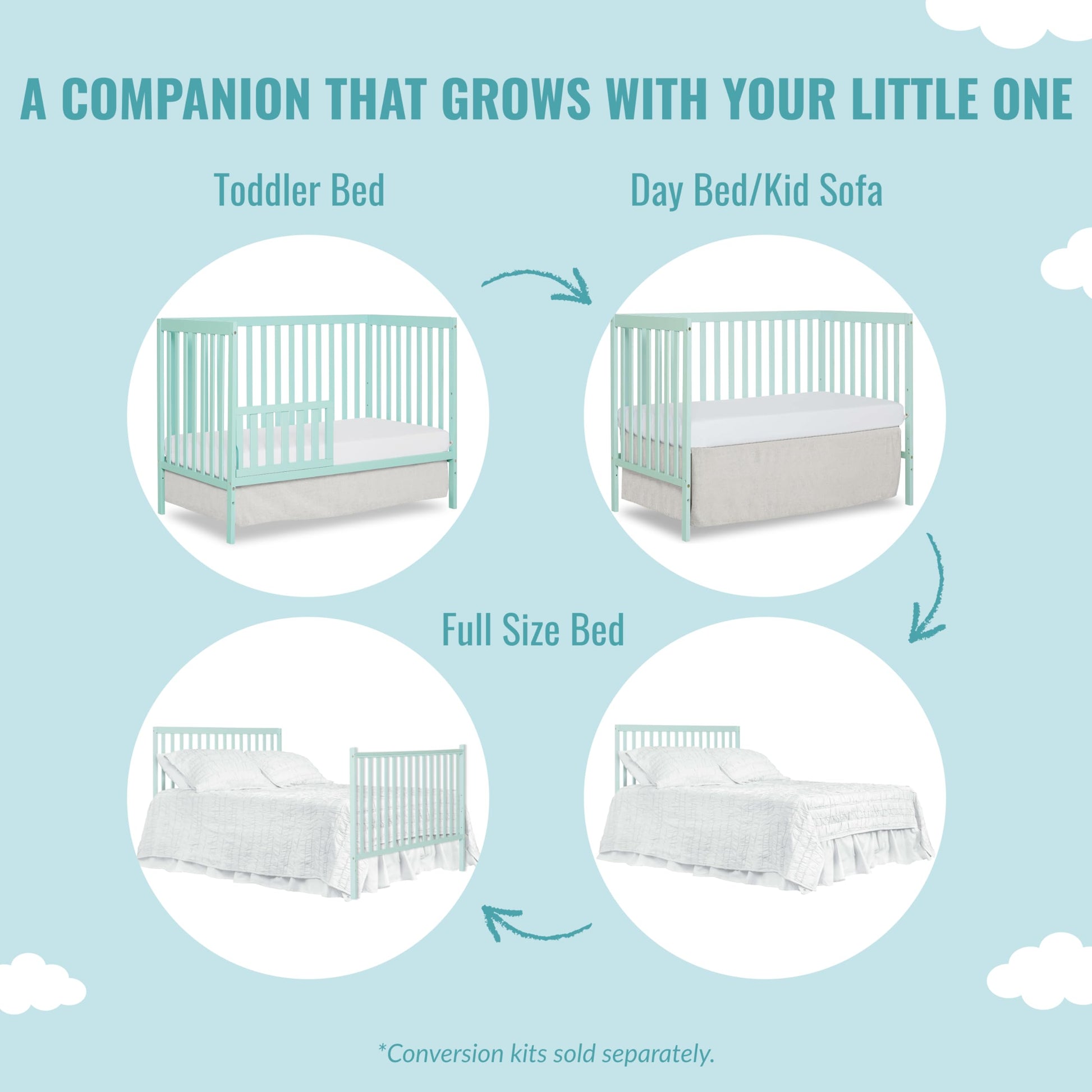 - 5-IN-1 CONVERTIBLE CRIB - A lifetime investment, the Synergy grows with your child, easily converting from a crib into a toddler, day and full-size bed; Toddler guardrail, stabilizer and full-size rail sold separately; Features 3 mattress height settings