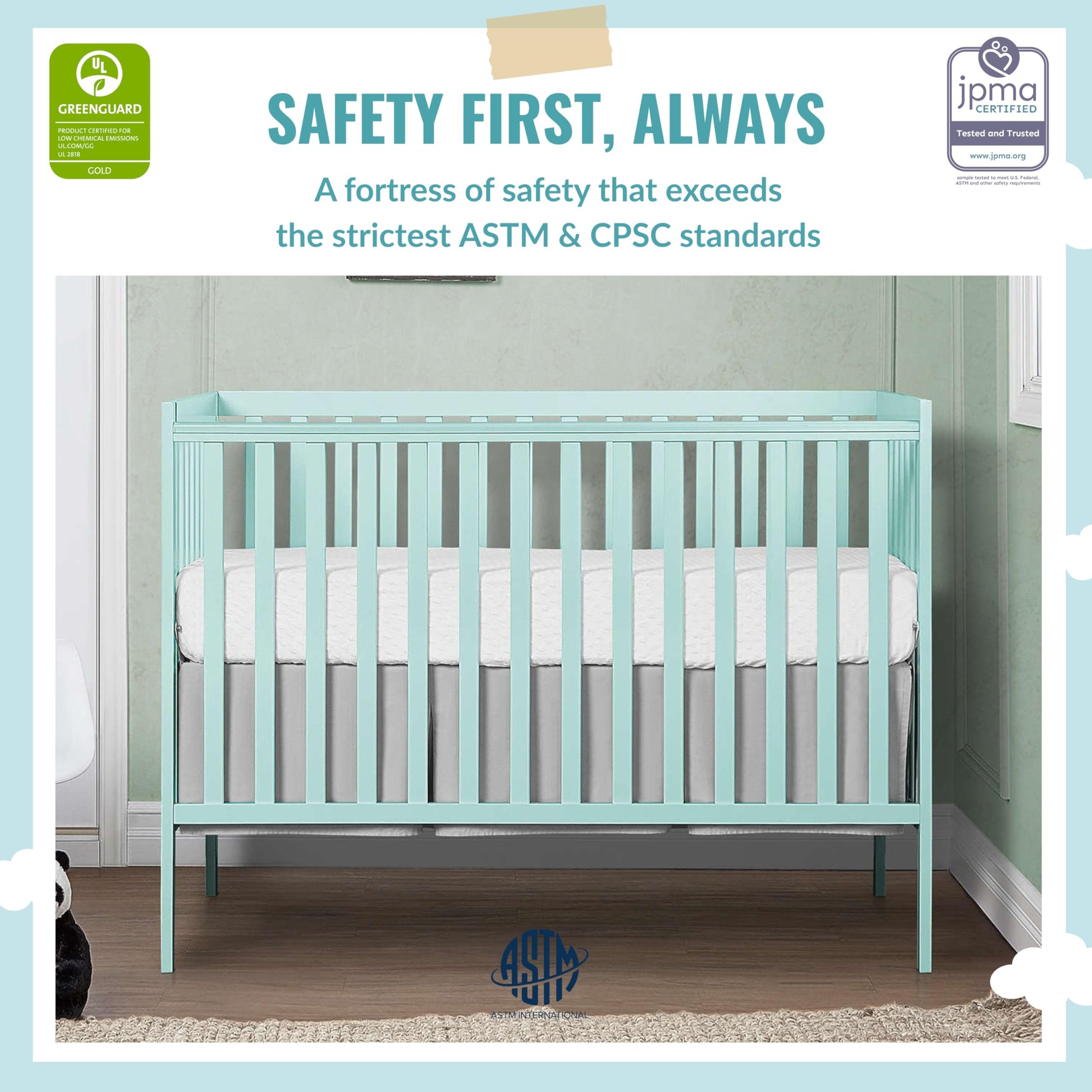 - SAFETY FIRST ALWAYS - This crib is JPMA Certified to meet or exceed all safety standards set by the CPSC & ASTM; All of our products are tested by 3rd party labs for lead and other toxic elements to meet or exceed CPSC and ASTM safety standards
