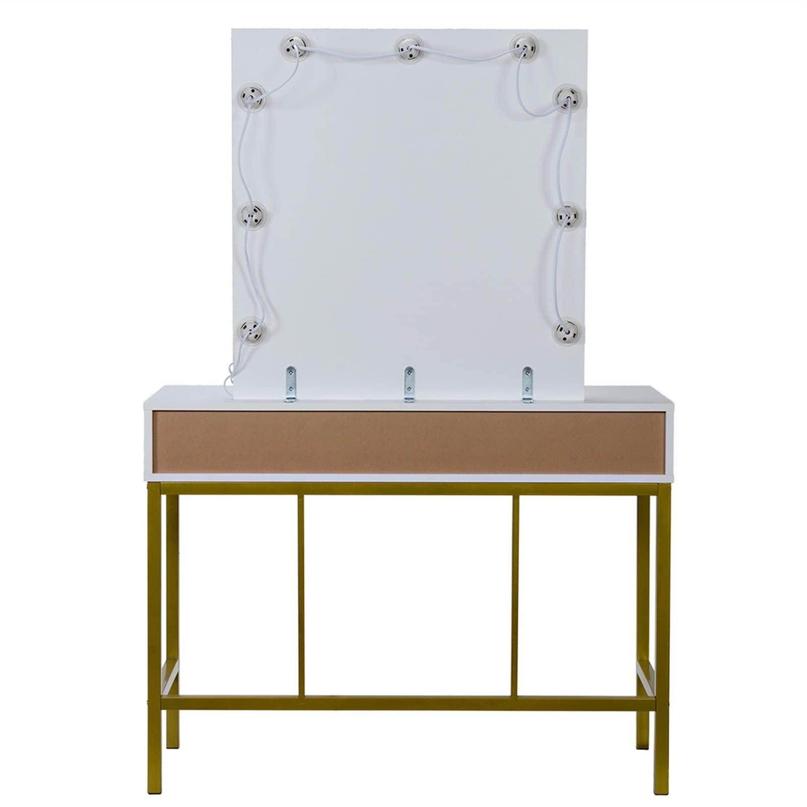 Table White Dressing Table Golden Steel Frame Square Mirror with 2 Drawer 9 Light Bulb