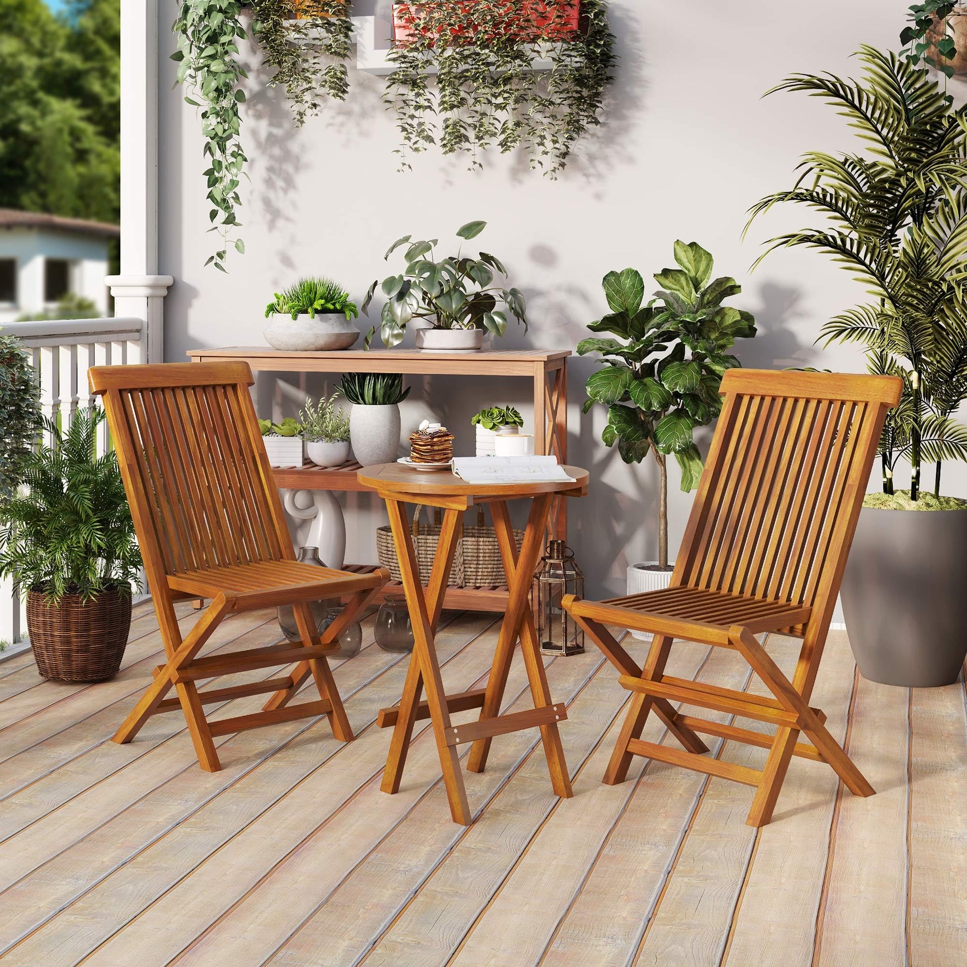 - Solid X-Frame: Enjoy a stable hangout with no wobbles or wiggles. The X-frame and secure metal buckles keep your solid wood bistro table and chairs set of 2 rock-steady