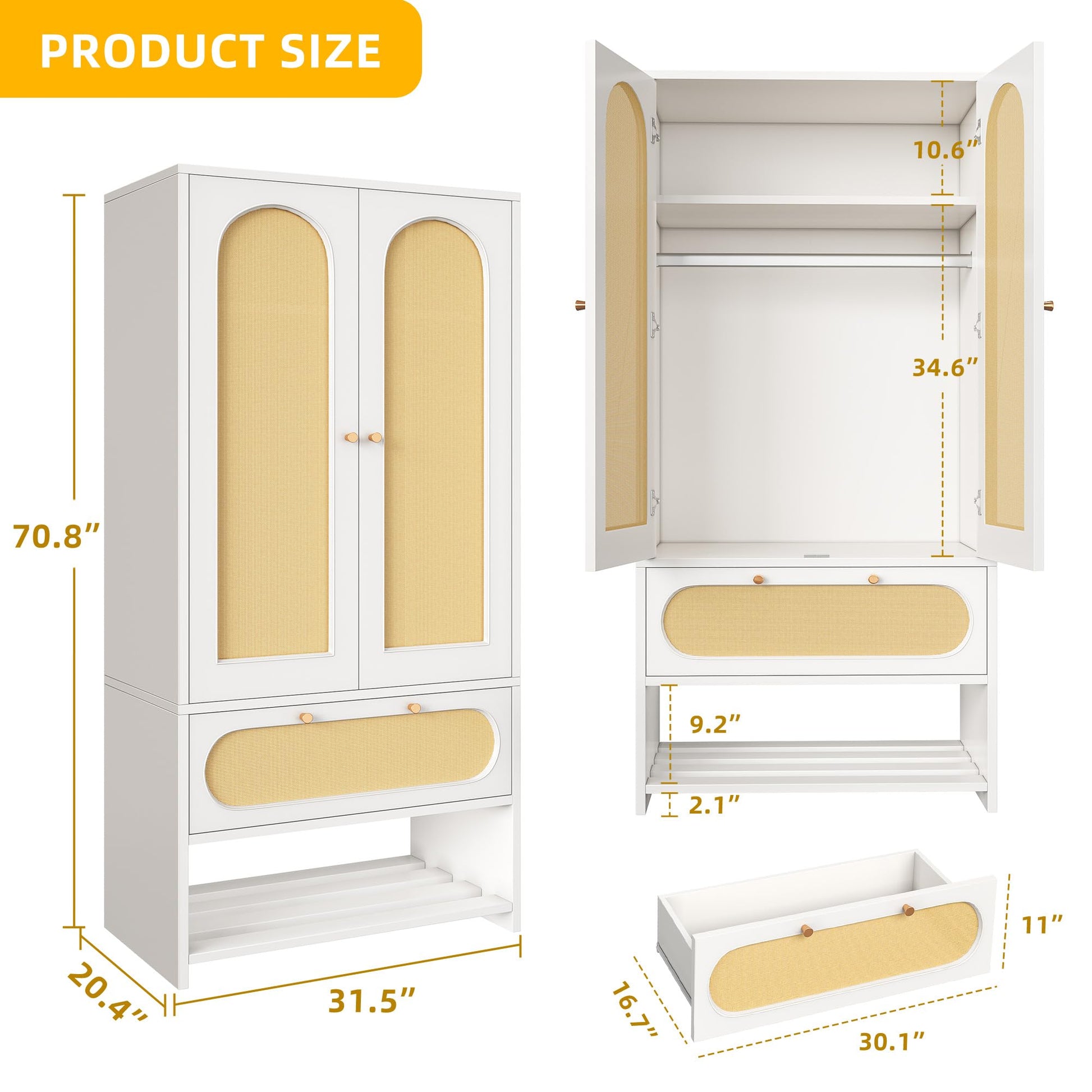 - Durable Construction: Made of durable engineered particle board to ensure strong bearing capacity, the large and thick bottom base offers reliable support for the entire armoire. The bottom of this wardrobe is made of metal to make it more durable. The overall dimensions of the White Rattan Armoire are 70.8" H x 31.5" W x 20.4" D.