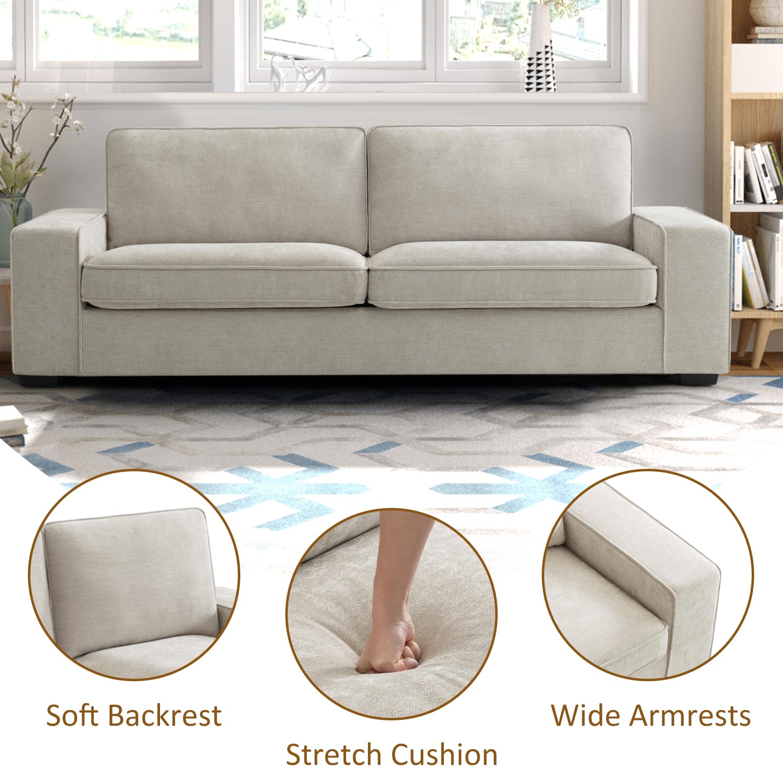 - SPACIOUS AND COMFORTABLE: This oversized sofa not only offers 27 inches of spacious seating but also features 9 inches of wide armrests, with overall dimensions of 32.68"D x 88.58"W x 33.07"H. The 26-inch deep seating accommodates two people with ease, and the thick sprung foam cushions and breathable fabrics provide soft support for the base and backrests, so you can enjoy an unparalleled level of comfort and comfort throughout a full day of relaxation and entertaining.