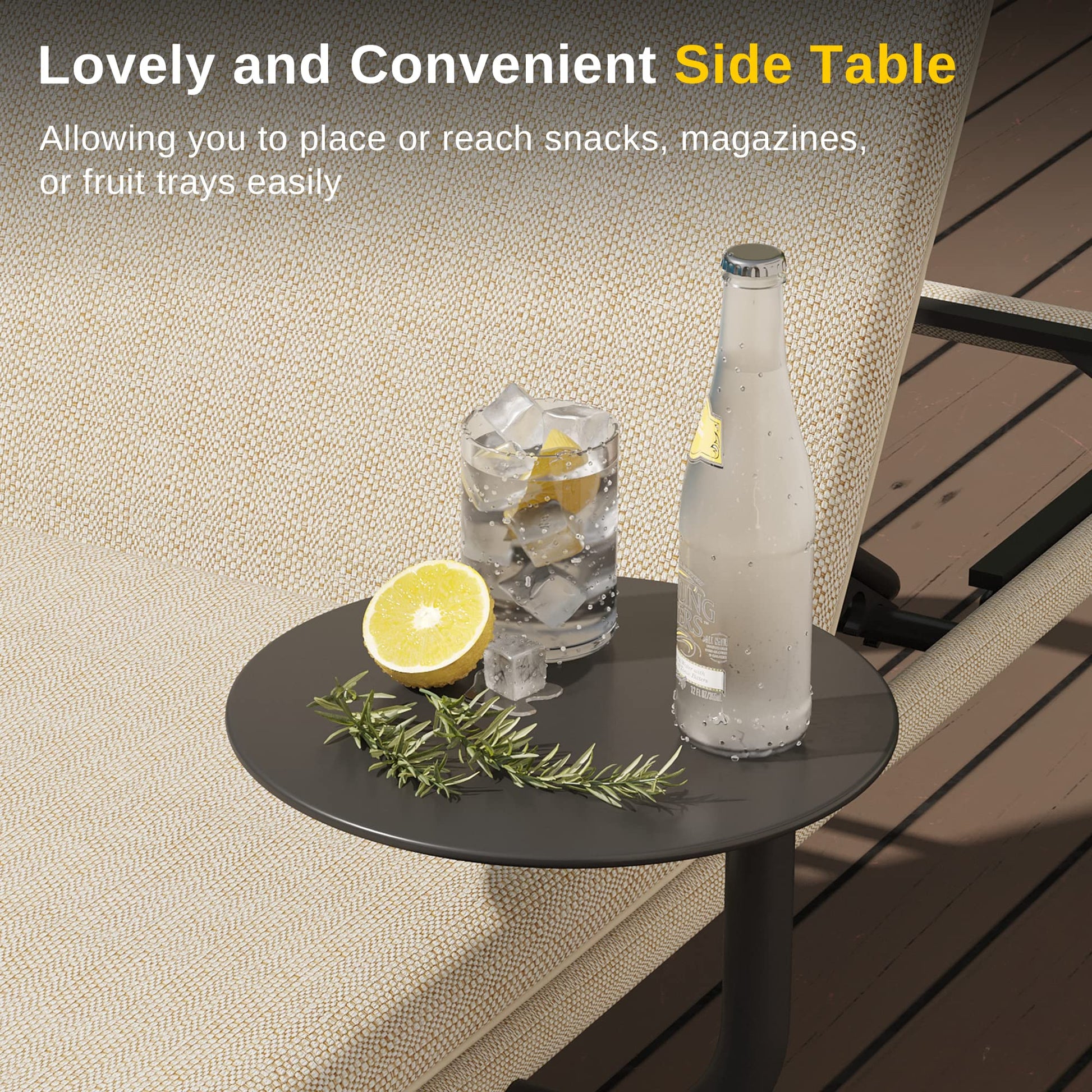 - Unique and Convenient Side Table: The integrated and sleek table design for our chaise lounge has a diameter of 11.8 inches and a weight capacity of 22 pounds, making it very convenient for holding coffee, cold drinks, and other items. This side table allows you to unleash your imagination—even when lying down to fish, it makes the perfect place to hold your fishing rod.