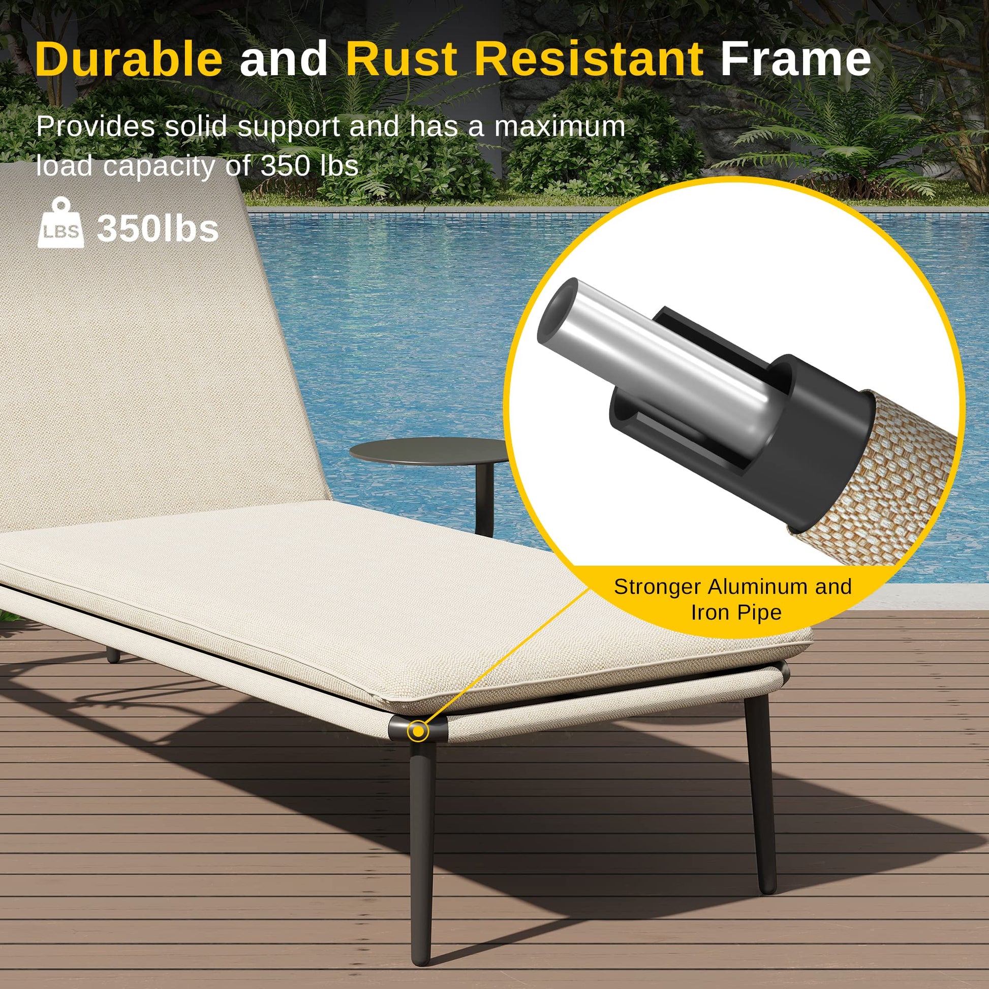 - Heavy Duty & Durable Frame: This lounge chair is made of a double-layer, heavy-duty powder-coated aluminum and iron frame, which ensures corrosion-inhibitive and rust preventing durablilty for long-term use. It can bear a maximum 350 pounds, and the thick legs improve the stability and safety against the ground.