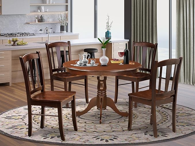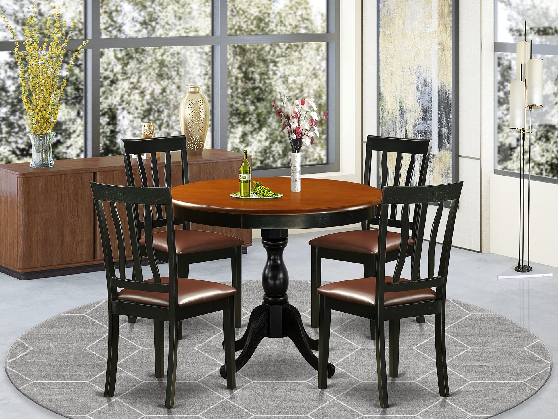 - MODERN DINING SET FINISH: This dining table is the epitome of refinement, featuring a kitchen table with a cherry tabletop and a pedestal leg made from hardwood with a black finish. The accompanying dining chairs exude elegance with their faux leather seats and sturdy black wooden legs. Carefully crafted with premium quality dinner table set boasts a color scheme that adds a touch of allure to your dining or kitchen area.