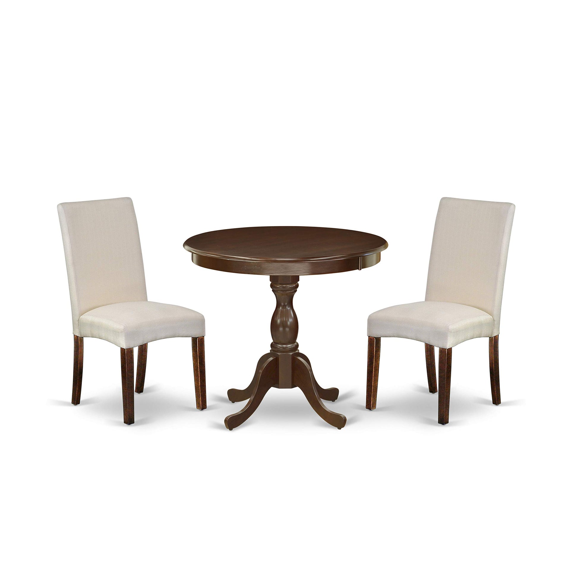 - WOOD TABLE SET FINISH: Our dining room table features a Mahogany Round Table Top and Pedestal Legs, while the parson chairs have a Cream Linen Fabric Seat and Mahogany Wooden 4 Legs. Designed with a traditional aesthetic, our beautiful wooden table and padded chairs can effortlessly enhance the visual appeal of any dining room decor. With their timeless style and exceptional quality, our dining set is perfect for hosting dinners and gatherings with friends and family.