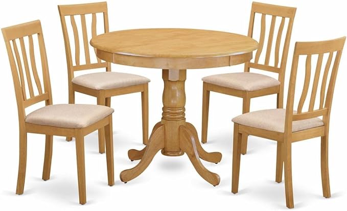 Antique 5 Piece Room Set Includes a Round Wooden Table with Pedestal and 4 Linen Fabric Kitchen Dining Chairs,