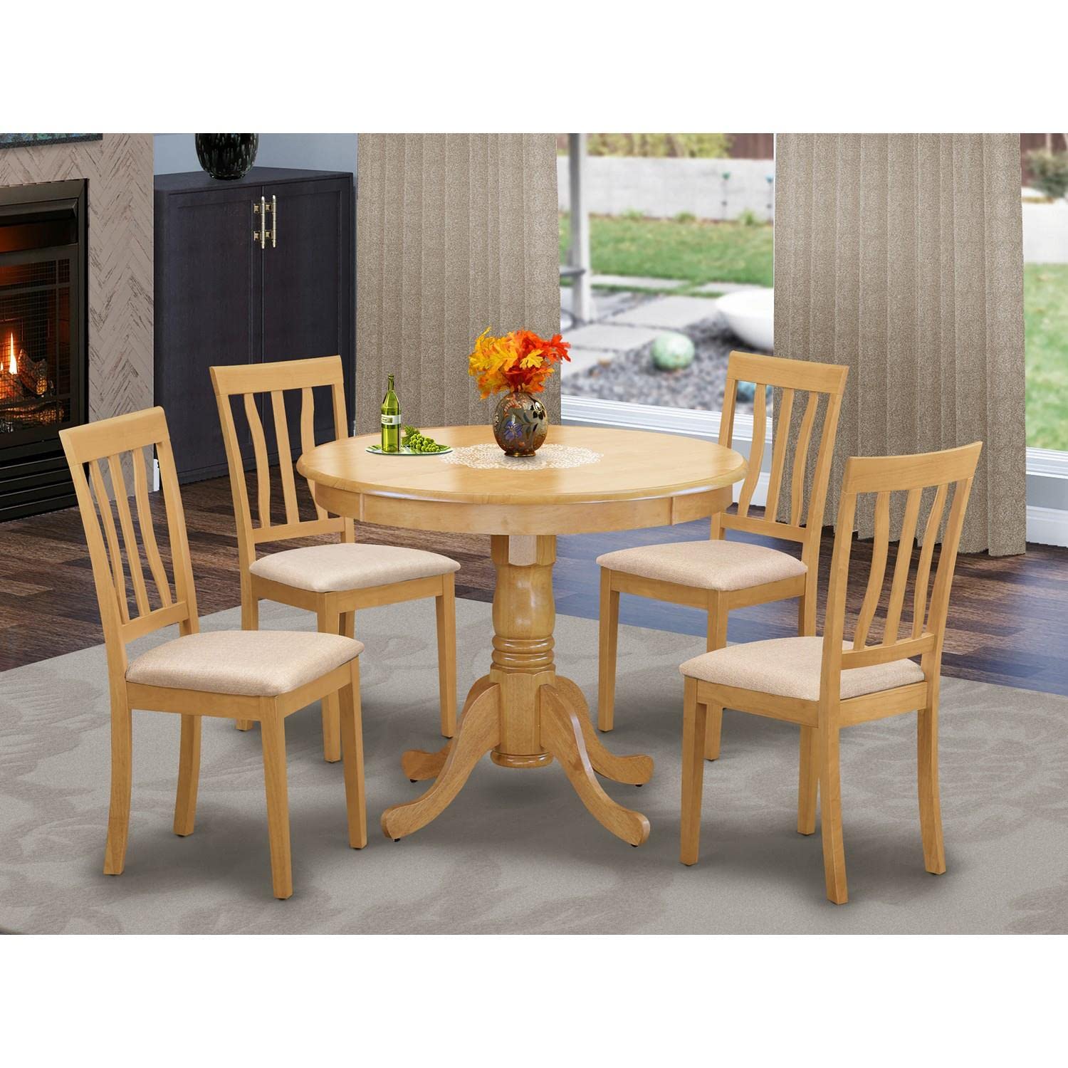 - DINING ROOM TABLE SET FINISH The dining set comprises dining chairs with cozy Linen Fabric seats and wooden legs, as well as a wood table crafted from high-quality Oak Finish wood. The combination of these materials results in a beautiful color scheme that adds a touch of elegance to your kitchen.