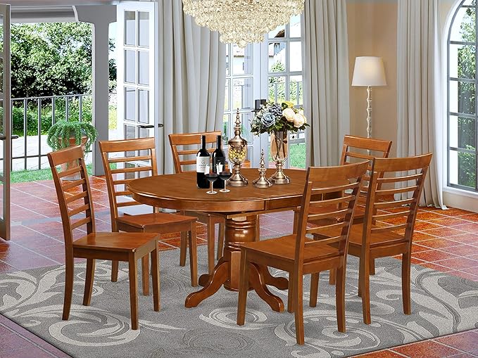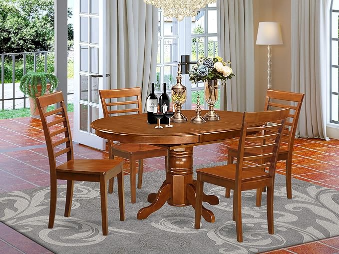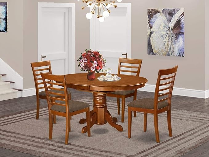 - KITCHEN TABLE SET FINISH: This elegantly designed dining table set offers unparalleled comfort, and has a Saddle Brown Oval tabletop and sturdy pedestal legs. The high-quality wood construction of the dining chairs' wooden seats. The exquisite color combination of this set imbues your kitchen with a sense of opulence and refinement, elevating the overall aesthetic of your space.