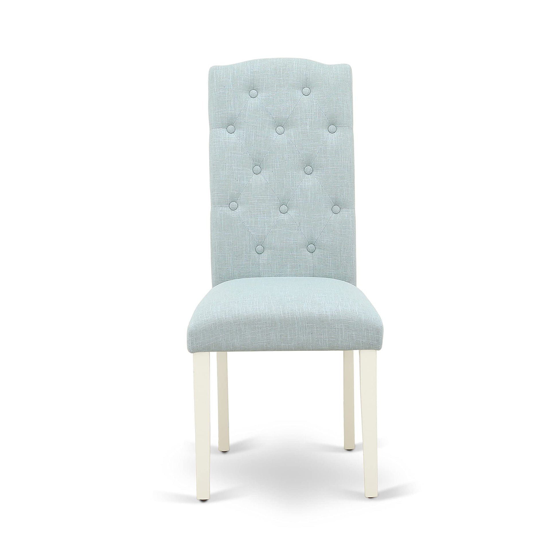 - MODERN DINING TABLE SET FINISH: Add a touch of magnificence to your amazing dining room with this nook kitchen table set, featuring a Linen White hardwood dinner table and body, and dining chairs upholstered in a wonderful Baby Blue Linen Fabric. The chairs are designed with button-tufted padding and a high back, providing both comfort and style to your dining area. Together, they enhance the overall magnificence of your dining room, making it truly amazing.