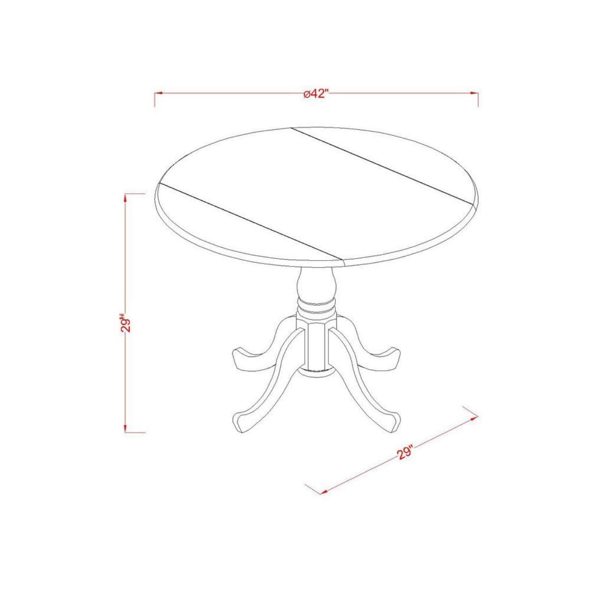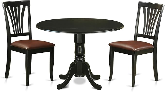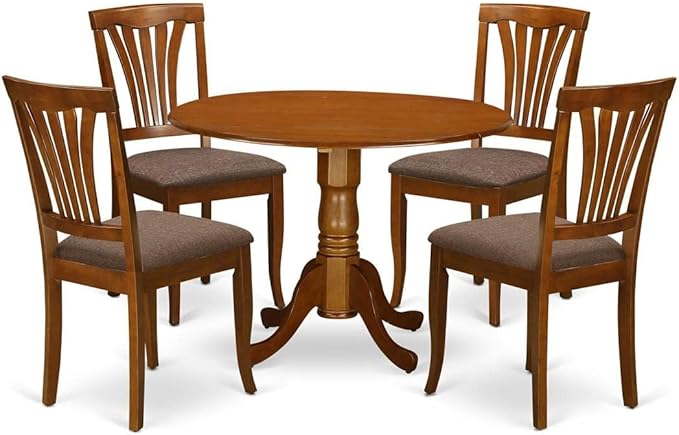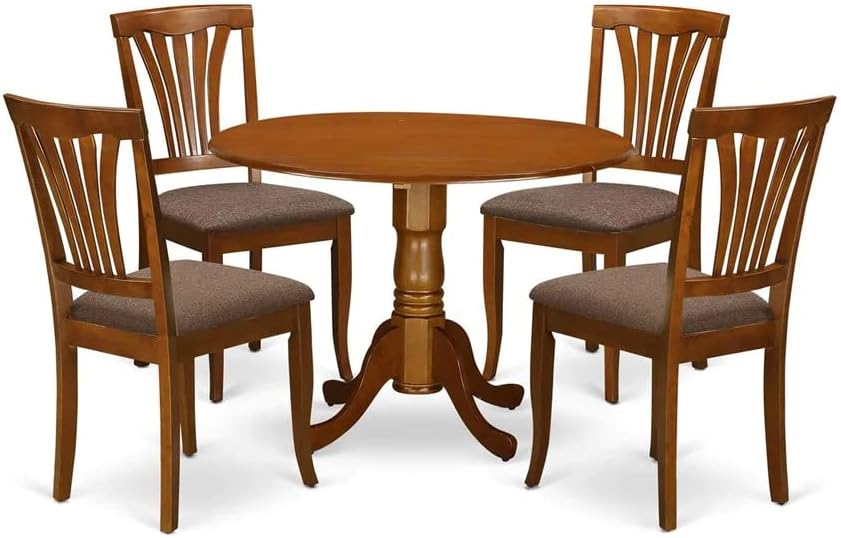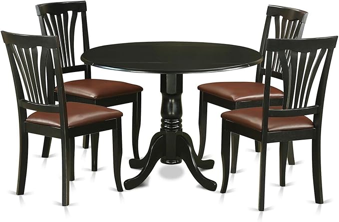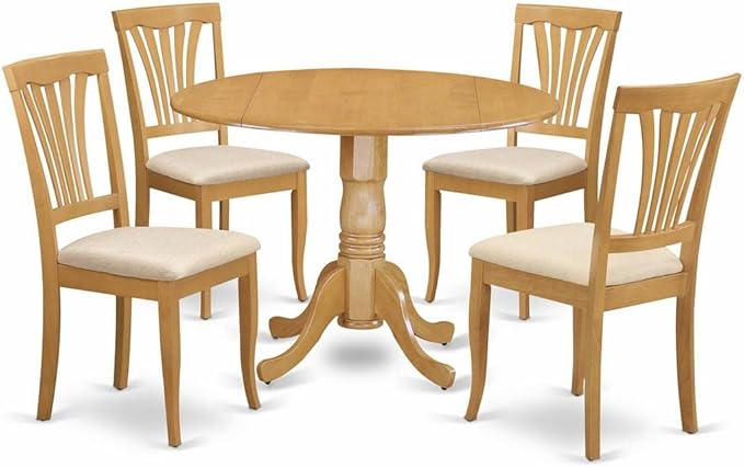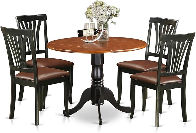 - KITCHEN TABLE SET: Our beautiful kitchen table set includes a stunning breakfast table and four great dining room chairs. The brilliant dining room chairs feature four solid wood legs and a slatted back, while the wooden dining table boasts a round top, pedestal legs, and two 9-inch drop leaves that add to the grace of your living area. By incorporating our kitchen set into your dining area, you can create an attractive space with an elegant charm.