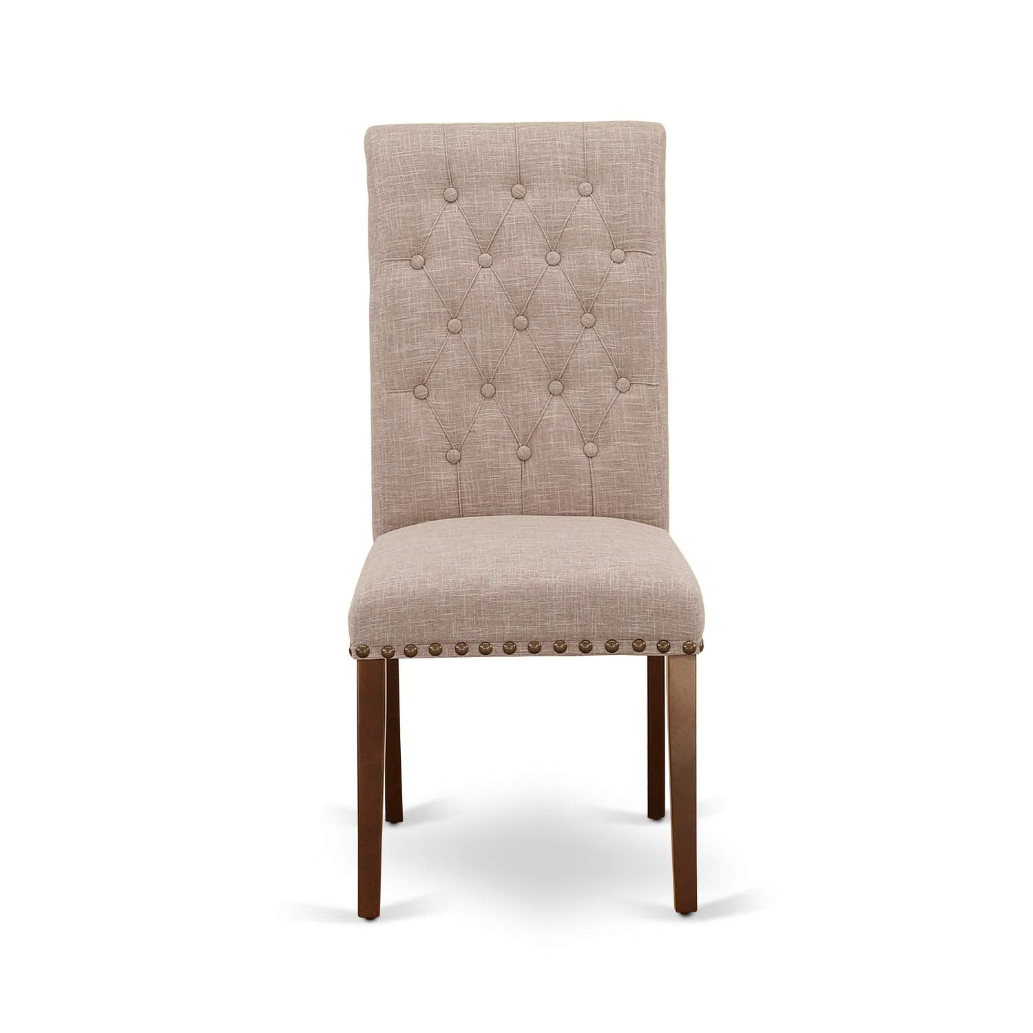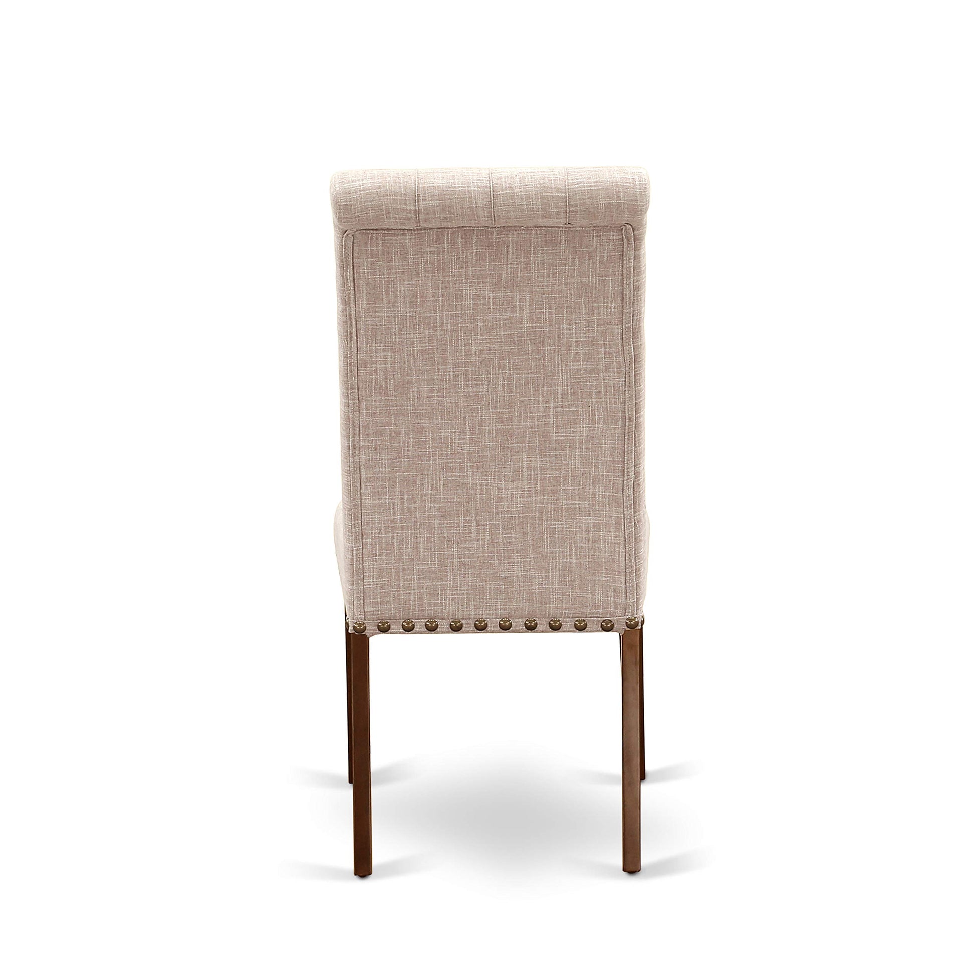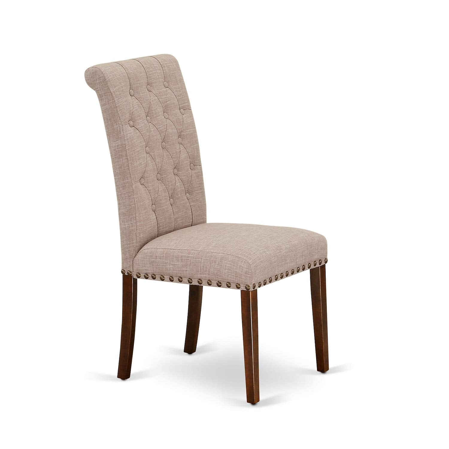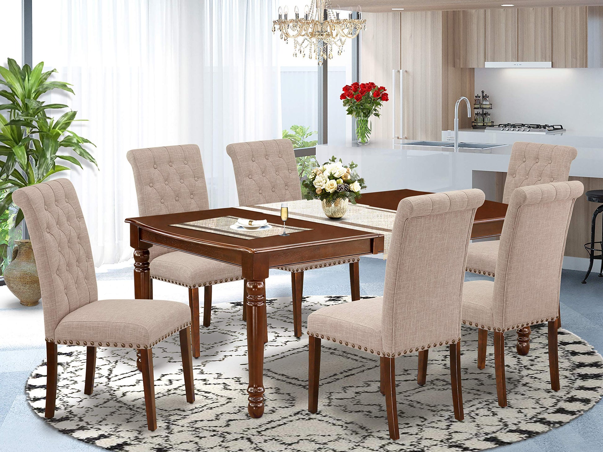 - DINING TABLE SET FINISH: The rectangular dining table set features a kitchen table constructed from Mahogany Hardwood with a Butterfly leaf design, complemented by kitchen chairs upholstered in exquisite Light Fawn Linen Fabric, complete with a tall roll back. This ensemble serves to enhance the aesthetic appeal of your dining area and elevate the grandeur of your esteemed dining room.