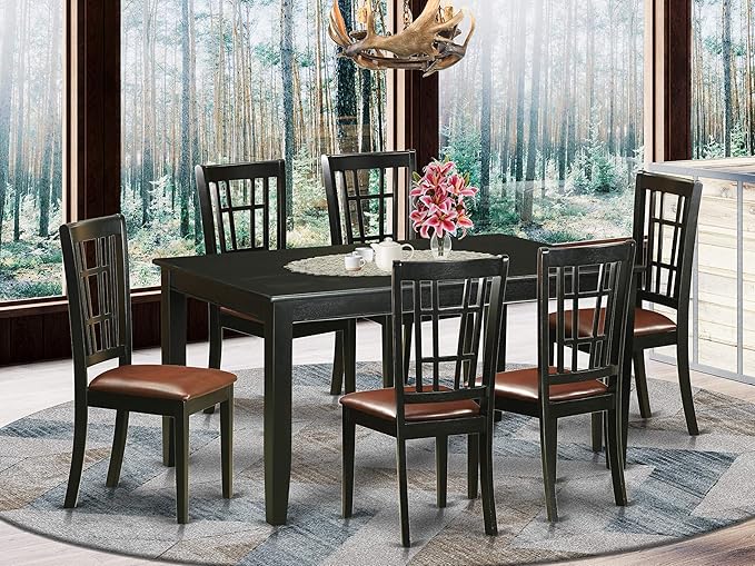 - KITCHEN DINING TABLE SET FINISH: The modern dining table set comes in a Black finish, giving it an elegant and nostalgic appearance. The breakfast table and chairs exude a luxurious and retro vibe. The seats of the kitchen are designed with Cherry Faux Leather for comfort, while the dining chairs have Black Asian wood legs and an open slatted back. The ergonomic design ensures a perfect fit for your body shape, allowing for optimal air circulation and creating a soft and cozy seating experience.